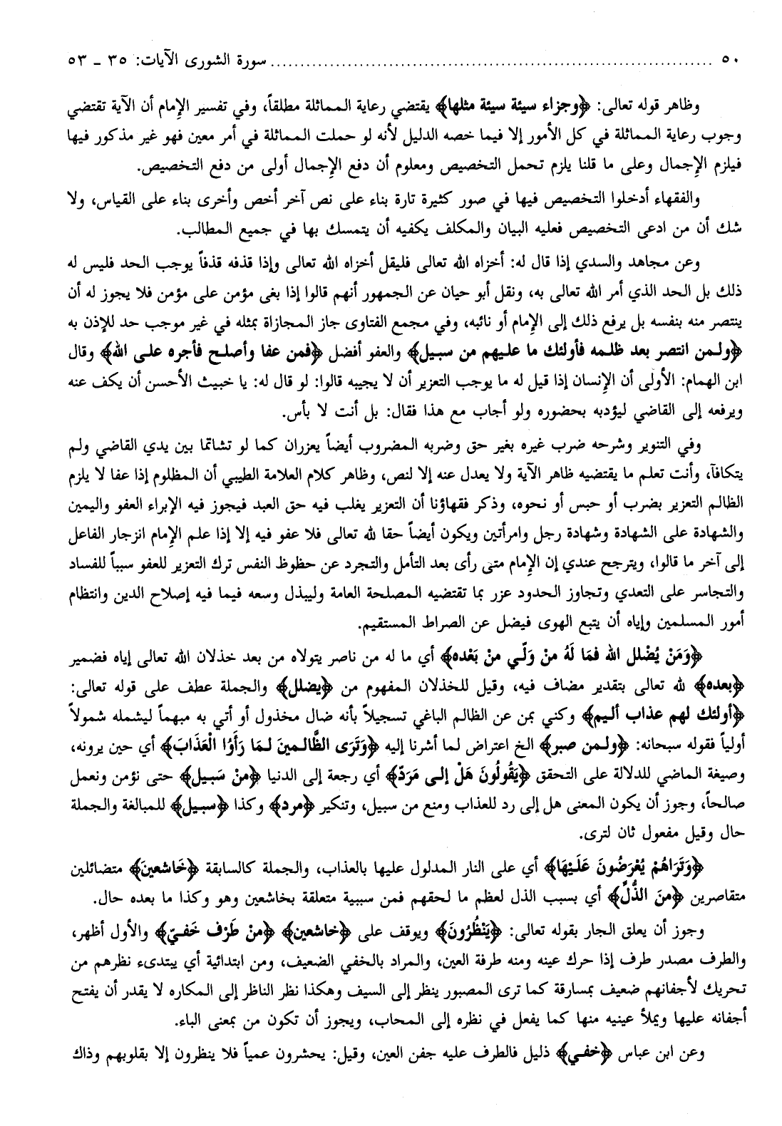 وظاهر قوله تعالى: وَجَزاءُ سَيِّئَةٍ سَيِّئَةٌ مِثْلُها يقتضي رعاية المماثلة مطلقا، وفي تفسير الإمام أن الآية تقتضي وجوب رعاية المماثلة في كل الأمور إلا فيما خصه الدليل لأنه لو حملت المماثلة في أمر معين فهو غير مذكور فيها فيلزم الإجمال وعلى ما قلنا يلزم تحمل التخصيص ومعلوم أن دفع الإجمال أولى من دفع التخصيص.