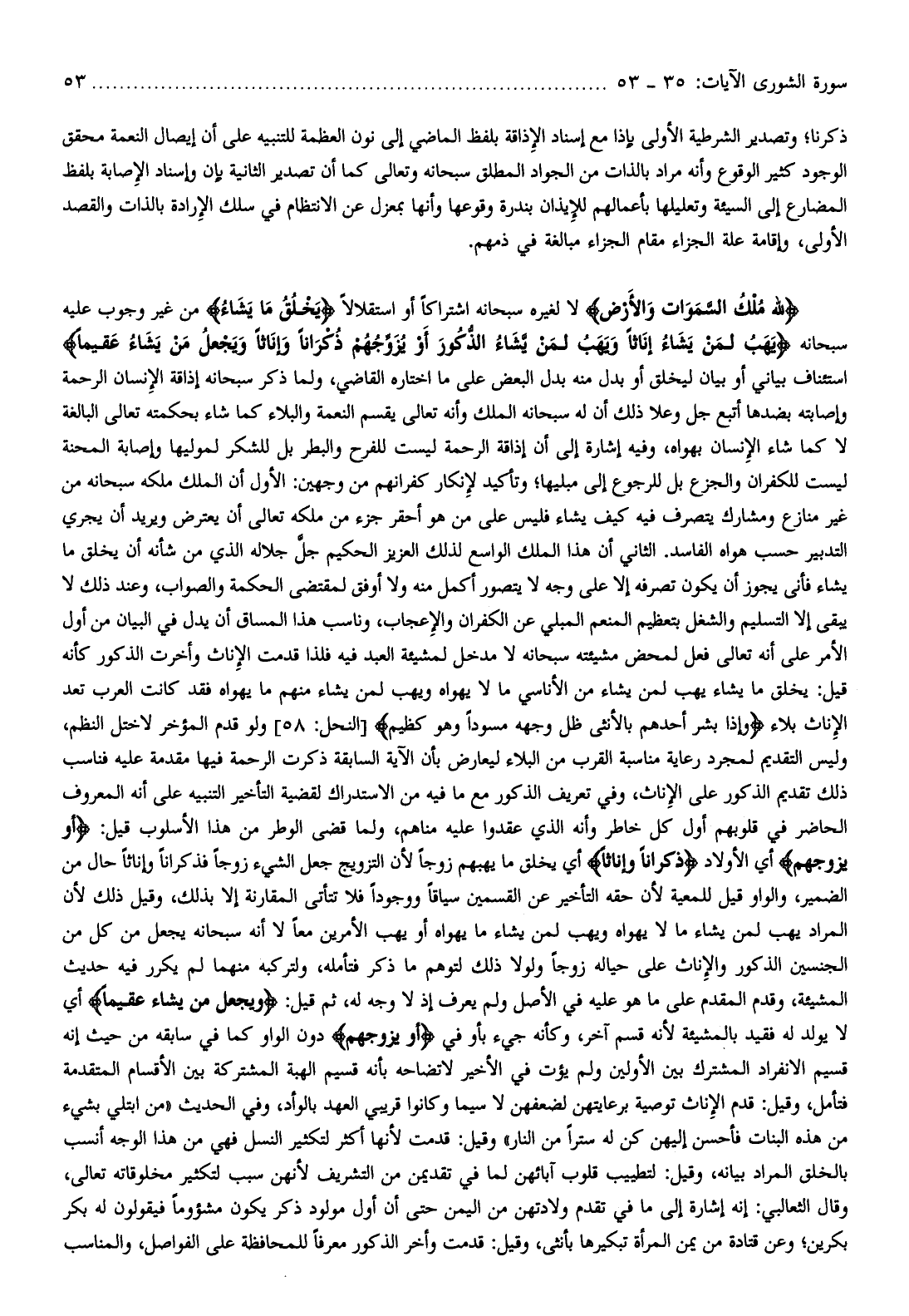 لِلَّهِ مُلْكُ السَّماواتِ وَالْأَرْضِ لا لغيره سبحانه اشتراكا أو استقلالا يَخْلُقُ ما يَشاءُ من غير وجوب عليه سبحانه يَهَبُ لِمَنْ يَشاءُ إِناثاً وَيَهَبُ لِمَنْ يَشاءُ الذُّكُورَ أَوْ يُزَوِّجُهُمْ ذُكْراناً وَإِناثاً وَيَجْعَلُ مَنْ يَشاءُ عَقِيماً استئناف بياني أو بيان ليخلق أو بدل منه بدل البعض على ما اختاره القاضي، ولما ذكر سبحانه إذاقة الإنسان الرحمة وإصابته بضدّها أتبع جل وعلا ذلك أن له سبحانه الملك وأنه تعالى يقسم النعمة والبلاء كما شاء بحكمته تعالى البالغة لا كما شاء الإنسان بهواه، وفيه إشارة إلى أن إذاقة الرحمة ليست للفرح والبطر بل للشكر لموليها وإصابة المحنة ليست للكفران والجزع بل للرجوع إلى مبليها وتأكيد لإنكار كفرانهم من وجهين: الأول أن الملك ملكه سبحانه من غير منازع ومشارك يتصرف فيه كيف يشاء فليس على من هو أحقر جزء من ملكه تعالى أن يعترض ويريد أن يجري التدبير حسب هواه الفاسد. الثاني أن هذا الملك الواسع لذلك العزيز الحكيم جلّ جلاله الذي من شأنه أن يخلق ما يشاء فأنى يجوز أن يكون تصرفه إلا على وجه لا يتصور أكمل منه ولا أوفق لمقتضى الحكمة والصواب، وعند ذلك لا يبقى إلا التسليم والشغل بتعظيم المنعم المبلي عن الكفران والإعجاب، وناسب هذا المساق أن يدل في البيان من أول الأمر على أنه تعالى فعل لمحض مشيئته سبحانه لا مدخل لمشيئة العبد فيه فلذا قدمت الإناث وأخرت الذكور كأنه قيل: يخلق ما يشاء يهب لمن يشاء من الأناسي ما لا يهواه ويهب لمن يشاء منهم ما يهواه فقد كانت العرب تعد الإناث بلاء وَإِذا بُشِّرَ أَحَدُهُمْ بِالْأُنْثى ظَلَّ وَجْهُهُ مُسْوَدًّا وَهُوَ كَظِيمٌ [النحل: 58] ولو قدم المؤخر لا ختل النظم، وليس التقديم لمجرد رعاية مناسبة القرب من البلاء ليعارض بأن الآية السابقة ذكرت الرحمة فيها مقدمة عليه فناسب ذلك تقديم الذكور على الإناث، وفي تعريف الذكور مع ما فيه من الاستدراك لقضية التأخير التنبيه على أنه المعروف الحاضر في قلوبهم أول كل خاطر وأنه الذي عقدوا عليه مناهم، ولما قضى الوطر من هذا الأسلوب قيل: أَوْ يُزَوِّجُهُمْ أي الأولاد ذُكْراناً وَإِناثاً أي يخلق ما يهبهم زوجا لأن التزويج جعل الشيء زوجا فذكرانا وإناثا حال من الضمير، والواو قيل للمعية لأن حقه التأخير عن القسمين سياقا ووجودا فلا تتأتى المقارنة إلا بذلك، وقيل ذلك لأن المراد يهب لمن يشاء ما لا يهواه ويهب لمن يشاء ما يهواه أو يهب الأمرين معا لا أنه سبحانه يجعل من كل من الجنسين الذكور والإناث على حياله زوجا ولولا ذلك لتوهم ما ذكر فتأمله، ولتركبه منهما لم يكرر فيه حديث المشيئة، وقدم المقدم على ما هو عليه في الأصل ولم يعرف إذ لا وجه له، ثم قيل: وَيَجْعَلُ مَنْ يَشاءُ عَقِيماً أي لا يولد له فقيد بالمشيئة لأنه قسم آخر، وكأنه جيء بأو في أَوْ يُزَوِّجُهُمْ دون الواو كما في سابقه من حيث إنه قسيم الانفراد المشترك بين الأولين ولم يؤت في الأخير لاتضاحه بأنه قسيم الهبة المشتركة بين الأقسام المتقدمة فتأمل، وقيل: قدم الإناث توصية برعايتهن لضعفهن لا سيما وكانوا قريبي العهد بالوأد، وفي الحديث «من ابتلي بشيء من هذه البنات فأحسن إليهن كن له سترا من النار» وقيل: قدمت لأنها أكثر لتكثير النسل فهي من هذا الوجه أنسب بالخلق المراد بيانه، وقيل: لتطييب قلوب آبائهن لما في تقديمن من التشريف لأنهن سبب لتكثير مخلوقاته تعالى، وقال الثعالبي: إنه إشارة إلى ما في تقدم ولادتهن من اليمن حتى أن أول مولود ذكر يكون مشؤوما فيقولون له بكر بكرين وعن قتادة من يمن المرأة تبكيرها بأنثى، وقيل: قدمت وأخر الذكور معرفا للمحافظة على الفواصل، والمناسب