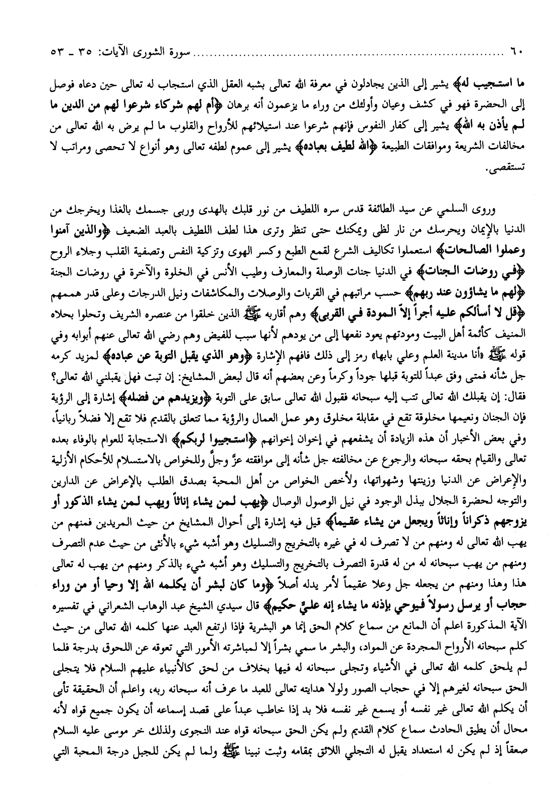 فقال: إن يقبلك الله تعالى تتب إليه سبحانه فقبول الله تعالى سابق على التوبة وَيَزِيدُهُمْ مِنْ فَضْلِهِ إشارة إلى الرؤية فإن الجنان ونعيمها مخلوقة تقع في مقابلة مخلوق وهو عمل العمال والرؤية مما تتعلق بالقديم فلا تقع إلا فضلا ربانيا، وفي بعض الأخبار أن هذه الزيادة أن يشفعهم في إخوان إخوانهم اسْتَجِيبُوا لِرَبِّكُمْ الاستجابة للعوام بالوفاء بعده تعالى والقيام بحقه سبحانه والرجوع عن مخالفته جل شأنه إلى موافقته عزّ وجلّ وللخواص بالاستسلام للأحكام الأزلية والإعراض عن الدنيا وزينتها وشهواتها، ولأخص الخواص من أهل المحبة بصدق الطلب بالإعراض عن الدارين والتوجه لحضرة الجلال ببذل الوجود في نيل الوصول الوصال يَهَبُ لِمَنْ يَشاءُ إِناثاً وَيَهَبُ لِمَنْ يَشاءُ الذُّكُورَ أَوْ يُزَوِّجُهُمْ ذُكْراناً وَإِناثاً وَيَجْعَلُ مَنْ يَشاءُ عَقِيماً قيل فيه إشارة إلى أحوال المشايخ من حيث المريدين فمنهم من يهب الله تعالى له ومنهم من لا تصرف له في غيره بالتخريج والتسليك وهو أشبه شيء بالأنثى من حيث عدم التصرف ومنهم من يهب سبحانه له من له قدرة التصرف بالتخريج والتسليك وهو أشبه شيء بالذكر ومنهم من يهب له تعالى هذا وهذا ومنهم من يجعله جل وعلا عقيما لأمر يدله أصلا وَما كانَ لِبَشَرٍ أَنْ يُكَلِّمَهُ اللَّهُ إِلَّا وَحْياً أَوْ مِنْ وَراءِ حِجابٍ أَوْ يُرْسِلَ رَسُولًا فَيُوحِيَ بِإِذْنِهِ ما يَشاءُ إِنَّهُ عَلِيٌّ حَكِيمٌ قال سيدي الشيخ عبد الوهاب الشعراني في تفسيره الآية المذكورة اعلم أن المانع من سماع كلام الحق إنما هو البشرية فإذا ارتفع العبد عنها كلمه الله تعالى من حيث كلم سبحانه الأرواح المجردة عن المواد، والبشر ما سمي بشرا إلا لمباشرته الأمور التي تعوقه عن اللحوق بدرجة فلما لم يلحق كلمه الله تعالى في الأشياء وتجلى سبحانه له فيها بخلاف من لحق كالأنبياء عليهم السلام فلا يتجلى الحق سبحانه لغيرهم إلا في حجاب الصور ولولا هدايته تعالى للعبد ما عرف أنه سبحانه ربه، واعلم أن الحقيقة تأبى أن يكلم الله تعالى غير نفسه أو يسمع غير نفسه فلا بد إذا خاطب عبدا على قصد إسماعه أن يكون جميع قواه لأنه محال أن يطيق الحادث سماع كلام القديم ولم يكن الحق سبحانه قواه عند النجوى ولذلك خر موسى عليه السلام صعقا إذ لم يكن له استعداد يقبل له التجلي اللائق بمقامه وثبت نبينا صلّى الله عليه وسلّم ولما لم يكن للجبل درجة المحبة التي
