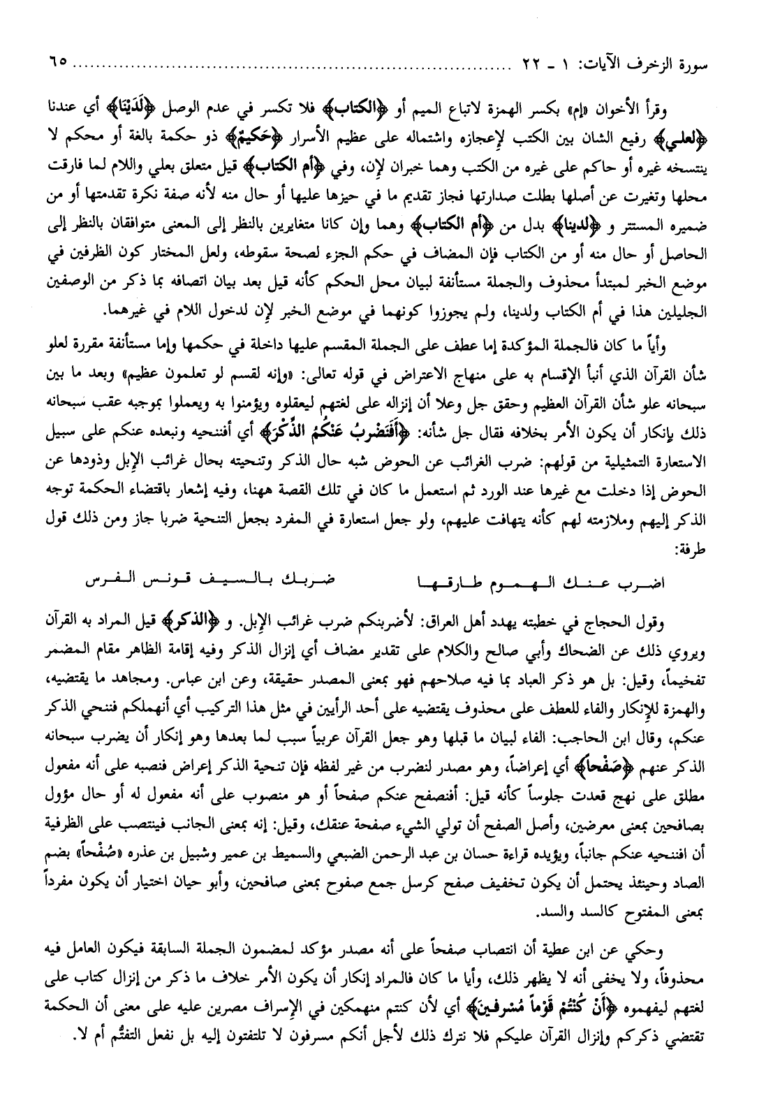 وقول الحجاج في خطبته يهدد أهل العراق: لأضربنكم ضرب غرائب الإبل. والذِّكْرَ قيل المراد به القرآن ويروي ذلك عن الضحاك وأبي صالح والكلام على تقدير مضاف أي إنزال الذكر وفيه إقامة الظاهر مقام المضمر تفخيما، وقيل: بل هو ذكر العباد بما فيه صلاحهم فهو بمعنى المصدر حقيقة، وعن ابن عباس. ومجاهد ما يقتضيه، والهمزة للإنكار والفاء للعطف على محذوف يقتضيه على أحد الرأيين في مثل هذا التركيب أي أنهملكم فننحي الذكر عنكم، وقال ابن الحاجب: الفاء لبيان ما قبلها وهو جعل القرآن عربيا سبب لما بعدها وهو إنكار أن يضرب سبحانه الذكر عنهم صَفْحاً أي إعراضا، وهو مصدر لنضرب من غير لفظه فإن تنحية الذكر إعراض فنصبه على أنه مفعول مطلق على نهج قعدت جلوسا كأنه قيل: أفنصفح عنكم صفحا أو هو منصوب على أنه مفعول له أو حال مؤول بصافحين بمعنى معرضين، وأصل الصفح أن تولي الشيء صفحة عنقك، وقيل: إنه بمعنى الجانب فينتصب على الظرفية أن أفننحيه عنكم جانبا، ويؤيده قراءة حسان بن عبد الرحمن الضبعي والسميط بن عمير وشبيل بن عذره «صفحا» بضم الصاد وحينئذ يحتمل أن يكون تخفيف صفح كرسل جمع صفوح بمعنى صافحين، وأبو حيان اختيار أن يكون مفردا بمعنى المفتوح كالسد والسد.