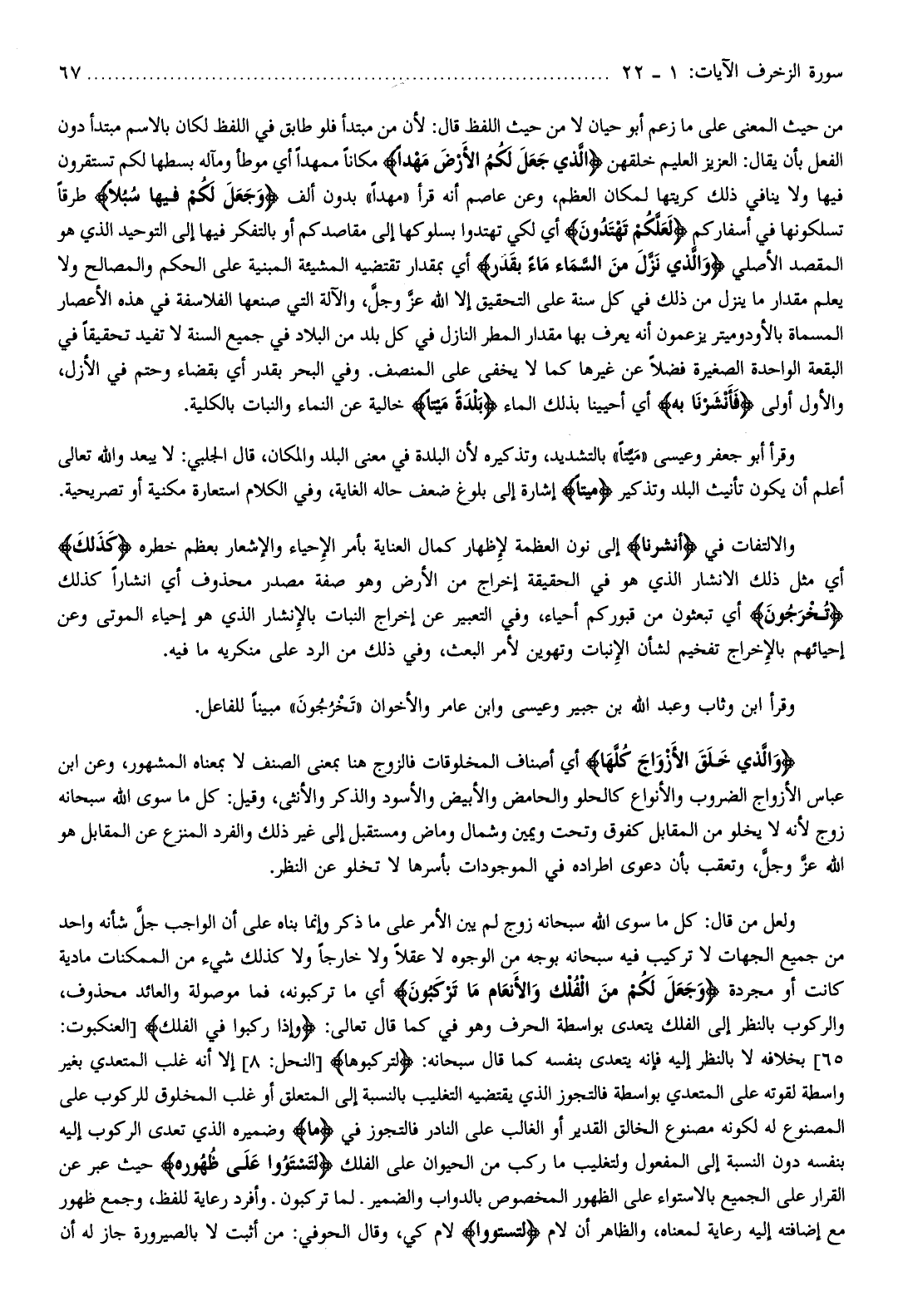 من حيث المعنى على ما زعم أبو حيان لا من حيث اللفظ قال: لأن من مبتدأ فلو طابق في اللفظ لكان بالاسم مبتدأ دون الفعل بأن يقال: العزيز العليم خلقهن الَّذِي جَعَلَ لَكُمُ الْأَرْضَ مَهْداً مكانا ممهدا أي موطأ ومآله بسطها لكم تستقرون فيها ولا ينافي ذلك كريتها لمكان العظم، وعن عاصم أنه قرأ «مهدا» بدون ألف وَجَعَلَ لَكُمْ فِيها سُبُلًا طرقا تسلكونها في أسفاركم لَعَلَّكُمْ تَهْتَدُونَ أي لكي تهتدوا بسلوكها إلى مقاصدكم أو بالتفكر فيها إلى التوحيد الذي هو المقصد الأصلي وَالَّذِي نَزَّلَ مِنَ السَّماءِ ماءً بِقَدَرٍ أي بمقدار تقتضيه المشيئة المبنية على الحكم والمصالح ولا يعلم مقدار ما ينزل من ذلك في كل سنة على التحقيق إلا الله عزّ وجلّ، والآلة التي صنعها الفلاسفة في هذه الأعصار المسماة بالأودوميتر يزعمون أنه يعرف بها مقدار المطر النازل في كل بلد من البلاد في جميع السنة لا تفيد تحقيقا في البقعة الواحدة الصغيرة فضلا عن غيرها كما لا يخفى على المنصف. وفي البحر بقدر أي بقضاء وحتم في الأزل، والأول أولى فَأَنْشَرْنا بِهِ أي أحيينا بذلك الماء بَلْدَةً مَيْتاً خالية عن النماء والنبات بالكلية.