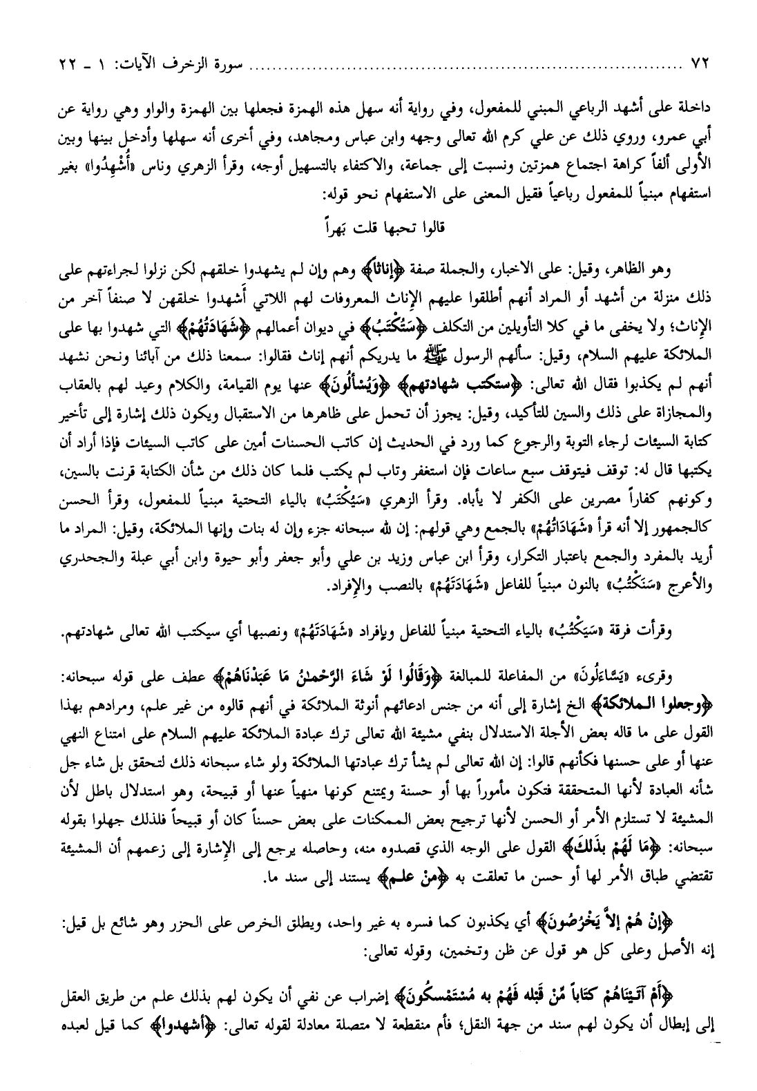 قالوا تحبها قلت بهرا وهو الظاهر، وقيل: على الاخبار، والجملة صفة إِناثاً وهم وإن لم يشهدوا خلقهم لكن نزلوا لجراءتهم على ذلك منزلة من أشهد أو المراد أنهم أطلقوا عليهم الإناث المعروفات لهم اللاتي أشهدوا خلقهن لا صنفا آخر من الإناث ولا يخفى ما في كلا التأويلين من التكلف سَتُكْتَبُ في ديوان أعمالهم شَهادَتُهُمْ التي شهدوا بها على الملائكة عليهم السلام، وقيل: سألهم الرسول صلّى الله عليه وسلّم ما يدريكم أنهم إناث فقالوا: سمعنا ذلك من آبائنا ونحن نشهد أنهم لم يكذبوا فقال الله تعالى: سَتُكْتَبُ شَهادَتُهُمْ وَيُسْئَلُونَ عنها يوم القيامة، والكلام وعيد لهم بالعقاب والمجازاة على ذلك والسين للتأكيد، وقيل: يجوز أن تحمل على ظاهرها من الاستقبال ويكون ذلك إشارة إلى تأخير كتابة السيئات لرجاء التوبة والرجوع كما