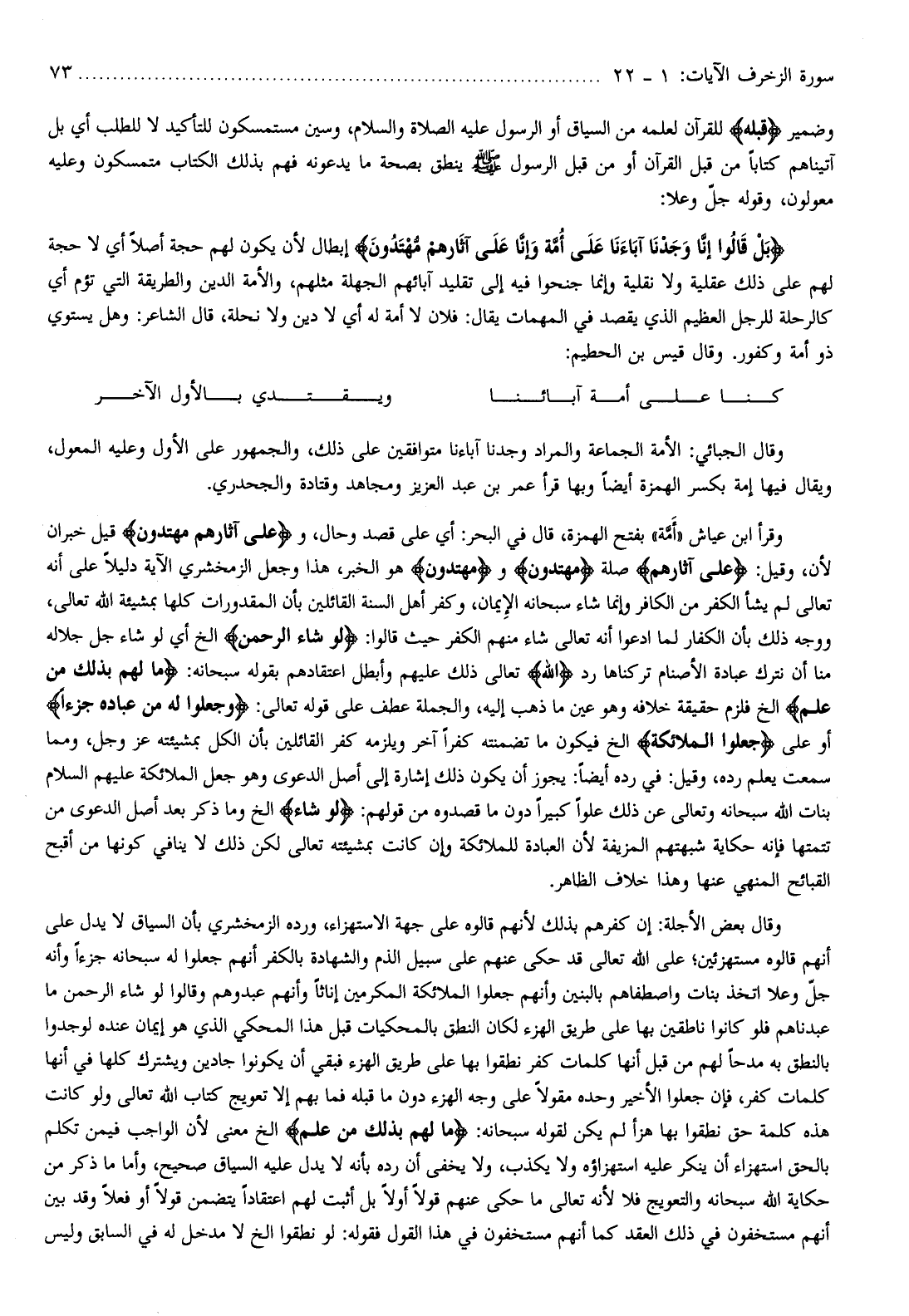 بَلْ قالُوا إِنَّا وَجَدْنا آباءَنا عَلى أُمَّةٍ وَإِنَّا عَلى آثارِهِمْ مُهْتَدُونَ إبطال لأن يكون لهم حجة أصلا أي لا حجة لهم على ذلك عقلية ولا نقلية وإنما جنحوا فيه إلى تقليد آبائهم الجهلة مثلهم، والأمة الدين والطريقة التي تؤم أي كالرحلة للرجل العظيم الذي يقصد في المهمات يقال: فلان لا أمة له أي لا دين ولا نحلة، قال الشاعر: وهل يستوي ذو أمة وكفور. وقال قيس بن الحطيم: