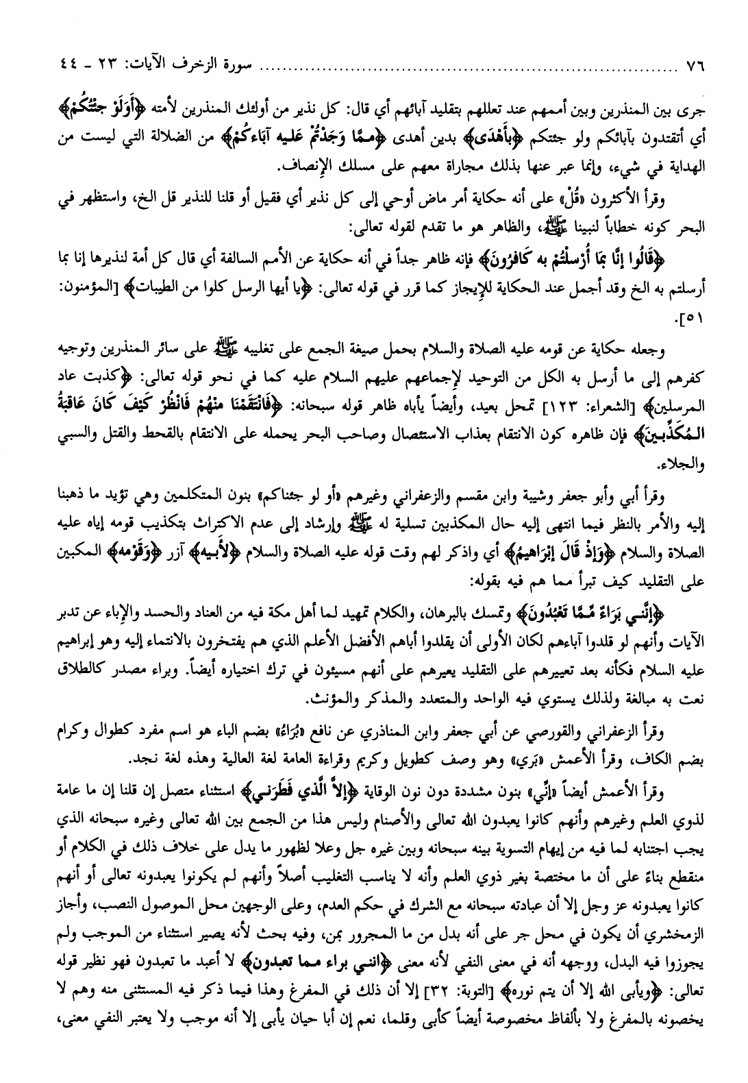 إِنَّنِي بَراءٌ مِمَّا تَعْبُدُونَ وتمسك بالبرهان، والكلام تمهيد لما أهل مكة فيه من العناد والحسد والإباء عن تدبر الآيات وأنهم لو قلدوا آباءهم لكان الأولى أن يقلدوا أباهم الأفضل الأعلم الذي هم يفتخرون بالانتماء إليه وهو إبراهيم عليه السلام فكأنه بعد تعييرهم على التقليد يعيرهم على أنهم مسيئون في ترك اختياره أيضا. وبراء مصدر كالطلاق نعت به مبالغة ولذلك يستوي فيه الواحد والمتعدد والمذكر والمؤنث.