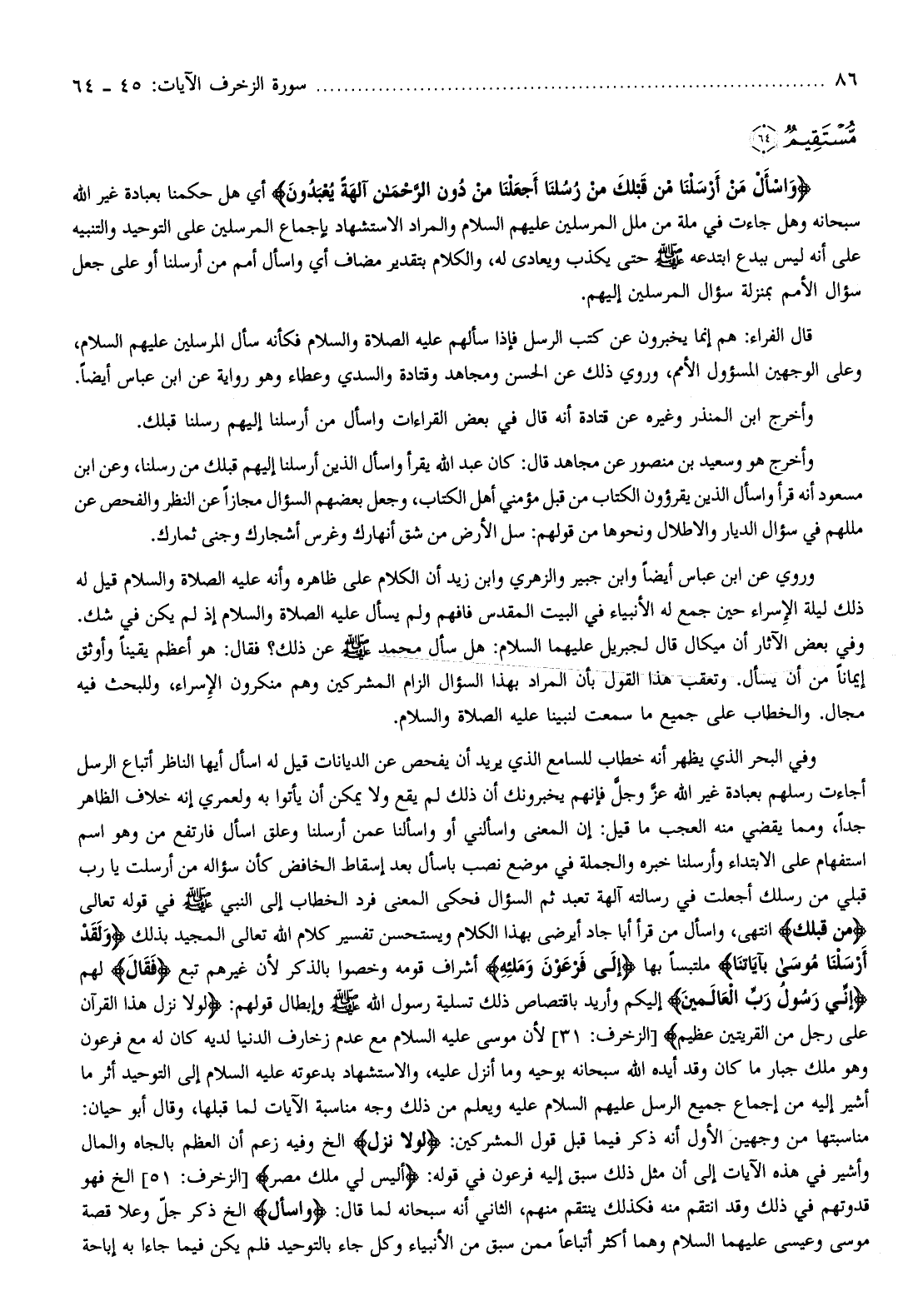 وَسْئَلْ مَنْ أَرْسَلْنا مِنْ قَبْلِكَ مِنْ رُسُلِنا أَجَعَلْنا مِنْ دُونِ الرَّحْمنِ آلِهَةً يُعْبَدُونَ أي هل حكمنا بعبادة غير الله سبحانه وهل جاءت في ملة من ملل المرسلين عليهم السلام والمراد الاستشهاد بإجماع المرسلين على التوحيد والتنبيه على أنه ليس ببدع ابتدعه صلّى الله عليه وسلّم حتى يكذب ويعادى له، والكلام بتقدير مضاف أي واسأل أمم من أرسلنا أو على جعل سؤال الأمم بمنزلة سؤال المرسلين إليهم.