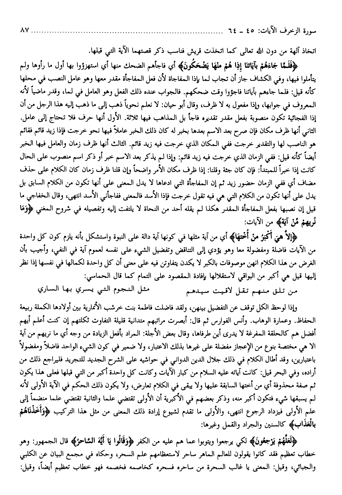 الثاني أنها ظرف مكان فإن صرح بعد الاسم بعدها بخبر له كان ذلك الخبر عاملا فيها نحو خرجت فإذا زيد قائم فقائم هو الناصب لها والتقدير خرجت ففي المكان الذي خرجت فيه زيد قائم. الثالث أنها ظرف زمان والعامل فيها الخبر أيضا كأنه قيل: ففي الزمان الذي خرجت فيه زيد قائم: وإذا لم يذكر بعد الاسم خبر أو ذكر اسم منصوب على الحال كانت إذا خبرا للمبتدأ: فإن كان جثة وقلنا: إذا ظرف مكان الأمر واضحا وإن قلنا ظرف زمان كان الكلام على حذف مضاف أي ففي الزمان حضور زيد ثم إن المفاجأة التي ادعاها لا يدل المعنى على أنها تكون من الكلام السابق بل يدل على أنها تكون من الكلام التي هي فيه تقول خرجت فإذا الأسد فالمعنى ففاجأني الأسد انتهى، وقال الخفاجي ما قيل إن نصبها بفعل المفاجأة المقدر هكذا لم يقله أحد من النحاة لا يلتفت إليه وتفصيله في شروح المغني وَما نُرِيهِمْ مِنْ آيَةٍ من الآيات: