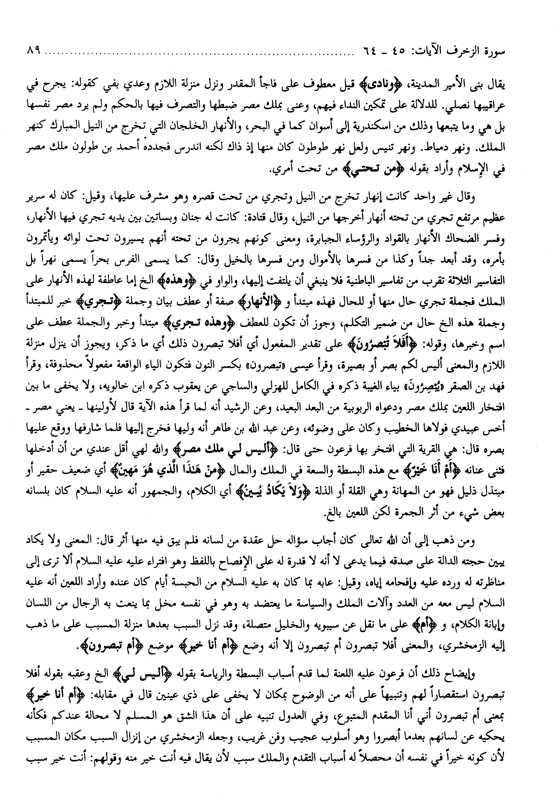 وقال غير واحد كانت أنهار تخرج من النيل وتجري من تحت قصره وهو مشرف عليها، وقيل: كان له سرير عظيم مرتفع تجري من تحته أنهار أخرجها من النيل، وقال قتادة: كانت له جنان وبساتين بين يديه تجري فيها الأنهار، وفسر الضحاك الأنهار بالقواد والرؤساء الجبابرة، ومعنى كونهم يجرون من تحته أنهم يسيرون تحت لوائه ويأتمرون بأمره، وقد أبعد جدا وكذا من فسرها بالأموال ومن فسرها بالخيل وقال: كما يسمى الفرس بحرا يسمى نهرا بل التفاسير الثلاثة تقرب من تفاسير الباطنية فلا ينبغي أن يلتفت إليها، والواو في وَهذِهِ إلخ إما عاطفة لهذه الأنهار على الملك فجملة تجري حال منها أو للحال فهذه مبتدأ والْأَنْهارُ صفة أو عطف بيان وجملة تَجْرِي خبر للمبتدأ وجملة هذه إلخ حال من ضمير التكلم، وجوز أن تكون للعطف وهذِهِ تَجْرِي مبتدأ وخبر والجملة عطف على اسم وخبرها، وقوله: أَفَلا تُبْصِرُونَ على تقدير المفعول أي أفلا تبصرون ذلك أي ما ذكر، ويجوز أن ينزل منزلة اللازم والمعنى أليس لكم بصر أو بصيرة، وقرأ عيسى «تبصرون» بكسر النون فتكون الياء الواقعة مفعولا محذوفة، وقرأ فهد بن الصقر «يبصرون» بياء الغيبة ذكره في الكامل للهزلي والساجي عن يعقوب ذكره ابن خالويه، ولا يخفى ما بين افتخار اللعين بملك مصر ودعواه الربوبية من البعد البعيد، وعن الرشيد أنه لما قرأ هذه الآية قال لأولينها- يعني مصر- أخس عبيدي فولاها الخطيب وكان على وضوئه، وعن عبد الله بن طاهر أنه وليها فخرج إليها فلما شارفها ووقع عليها بصره قال: هي القرية التي افتخر بها فرعون حتى قال: أَلَيْسَ لِي مُلْكُ مِصْرَ والله لهي أقل عندي من أن أدخلها فثنى عنانه أَمْ أَنَا خَيْرٌ مع هذه البسطة والسعة في الملك والمال مِنْ هذَا الَّذِي هُوَ مَهِينٌ أي ضعيف حقير أو مبتذل ذليل فهو من المهانة وهي القلة أو الذلة وَلا يَكادُ يُبِينُ أي الكلام، والجمهور أنه عليه السلام كان بلسانه بعض شيء من أثر الجمرة لكن اللعين بالغ.