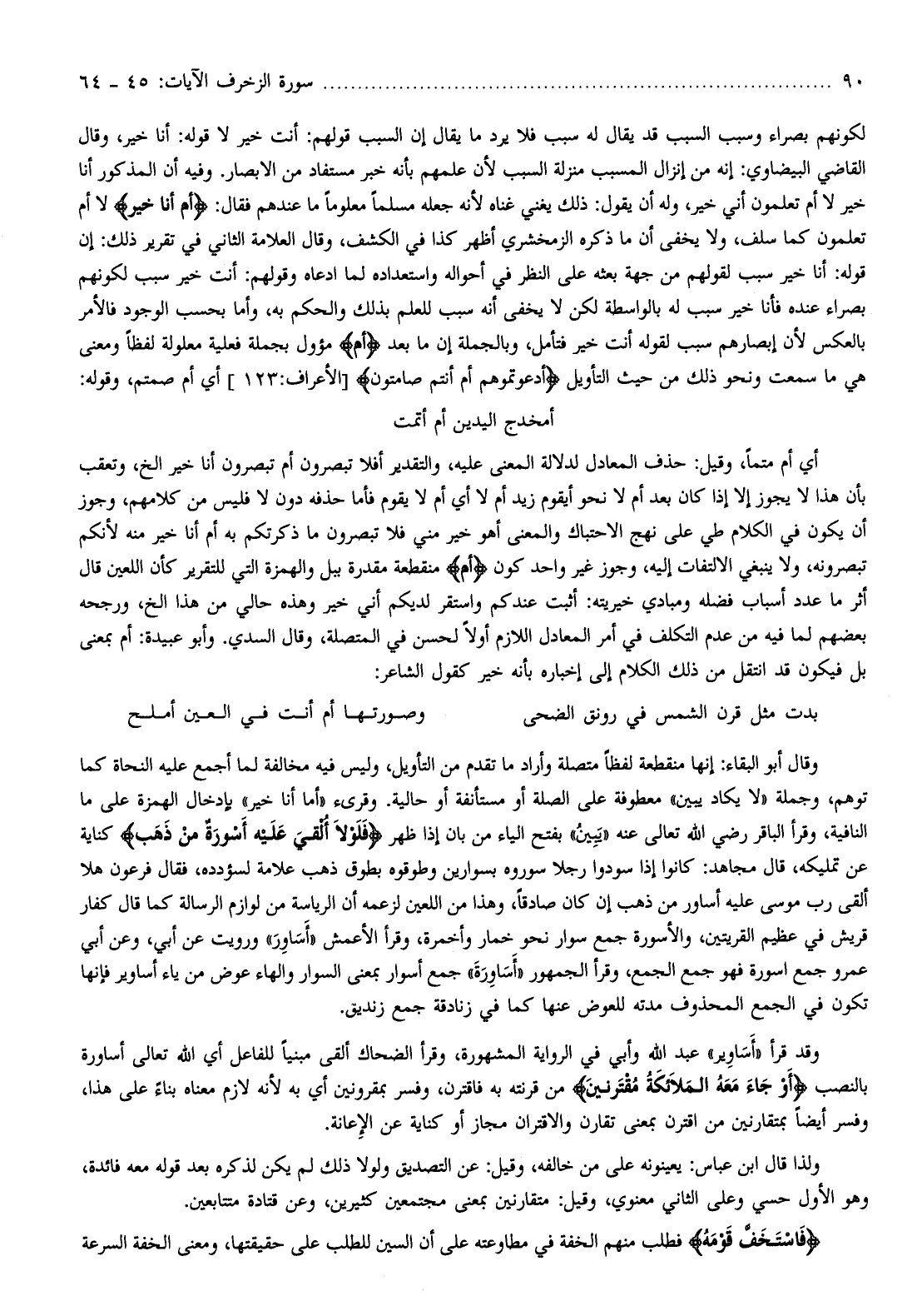 وقال أبو البقاء: إنها منقطعة لفظا متصلة وأراد ما تقدم من التأويل، وليس فيه مخالفة لما أجمع عليه النحاة كما توهم، وجملة «لا يكاد يبين» معطوفة على الصلة أو مستأنفة أو حالية. وقرىء «أما أنا خير» بإدخال الهمزة على ما النافية، وقرأ الباقر رضي الله تعالى عنه «يبين» بفتح الياء من بان إذا ظهر فَلَوْلا أُلْقِيَ عَلَيْهِ أَسْوِرَةٌ مِنْ ذَهَبٍ كناية عن تمليكه، قال مجاهد: كانوا إذا سودوا رجلا سوروه بسوارين وطوقوه بطوق ذهب علامة لسؤدده، فقال فرعون هلا ألقى رب موسى عليه أساور من ذهب إن كان صادقا، وهذا من اللعين لزعمه أن الرياسة من لوازم الرسالة كما قال كفار قريش في عظيم القريتين، والأسورة جمع سوار نحو خمار وأخمرة، وقرأ الأعمش «أساور» ورويت عن أبي، وعن أبي عمرو جمع اسورة فهو جمع الجمع، وقرأ الجمهور «أساورة» جمع أسوار بمعنى السوار والهاء عوض من ياء أساوير فإنها تكون في الجمع المحذوف مدته للعوض عنها كما في زنادقة جمع زنديق.
