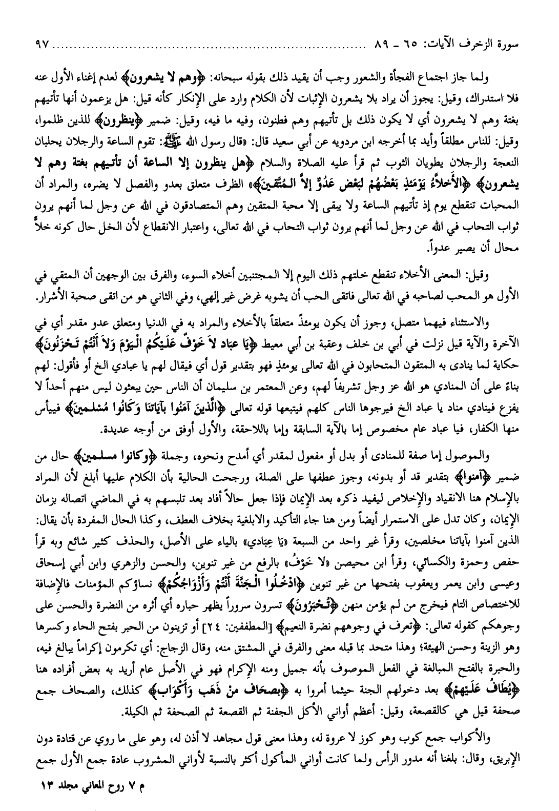 الذين آمنوا بآياتنا مخلصين، وقرأ غير واحد من السبعة «يا عبادي» بالياء على الأصل، والحذف كثير شائع وبه قرأ حفص وحمزة والكسائي، وقرأ ابن محيصن «لا خوف» بالرفع من غير تنوين، والحسن والزهري وابن أبي إسحاق وعيسى وابن يعمر ويعقوب بفتحها من غير تنوين ادْخُلُوا الْجَنَّةَ أَنْتُمْ وَأَزْواجُكُمْ نساؤكم المؤمنات فالإضافة للاختصاص التام فيخرج من لم يؤمن منهن تُحْبَرُونَ تسرون سرورا يظهر حباره أي أثره من النضرة والحسن على وجوهكم كقوله تعالى: تَعْرِفُ فِي وُجُوهِهِمْ نَضْرَةَ النَّعِيمِ [المطففين: 24] أو تزينون من الحبر بفتح الحاء وكسرها وهو الزينة وحسن الهيئة وهذا متحد بما قبله معنى والفرق في المشتق منه، وقال الزجاج: أي تكرمون إكراما يبالغ فيه، والحبرة بالفتح المبالغة في الفعل الموصوف بأنه جميل ومنه الإكرام فهو في الأصل عام أريد به بعض أفراده هنا يُطافُ عَلَيْهِمْ بعد دخولهم الجنة حيثما أمروا به بِصِحافٍ مِنْ ذَهَبٍ وَأَكْوابٍ كذلك، والصحاف جمع صحفة قيل هي كالقصعة، وقيل: أعظم أواني الأكل الجفنة ثم القصعة ثم الصحفة ثم الكيلة.
