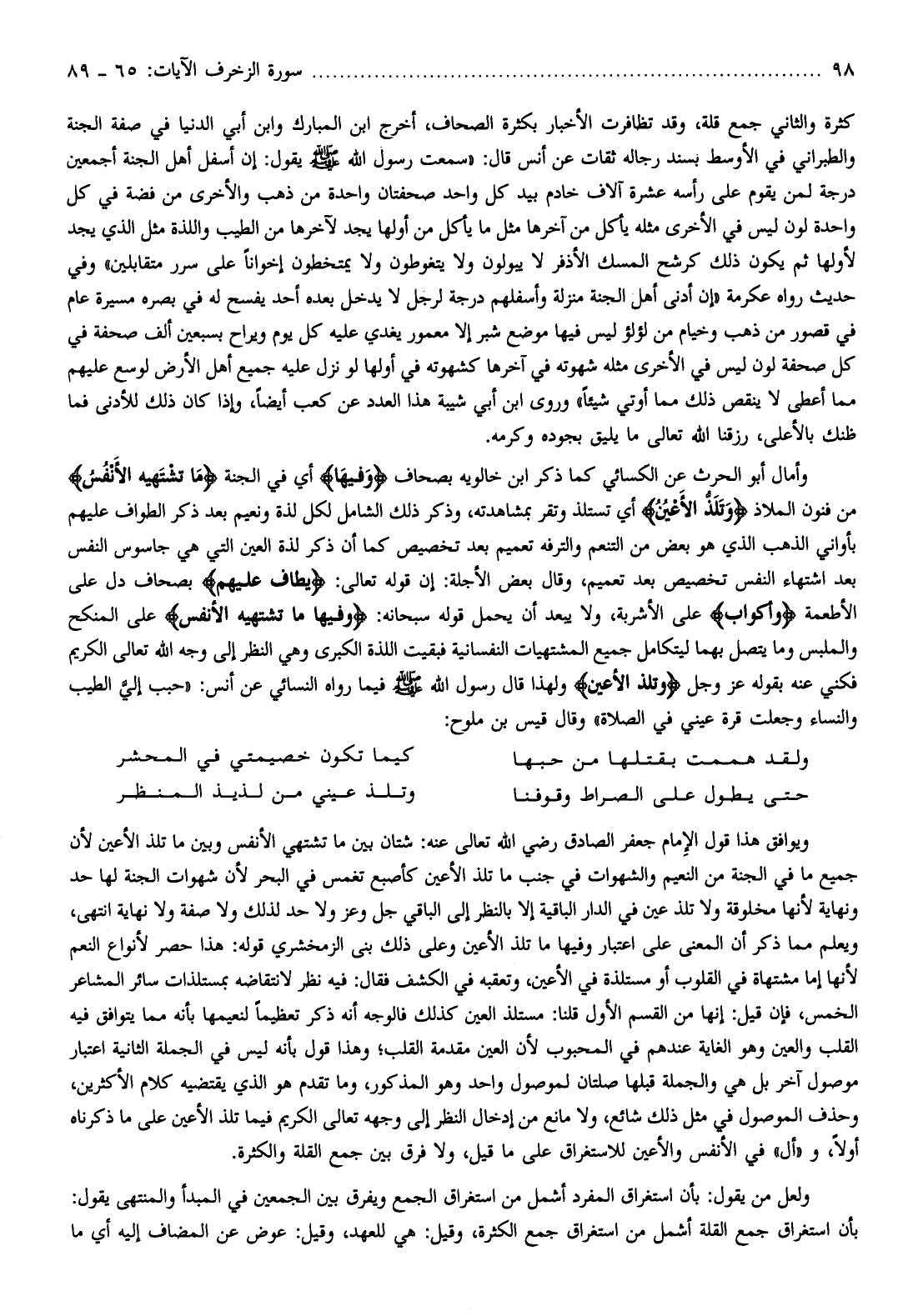 وأمال أبو الحرث عن الكسائي كما ذكر ابن خالويه بصحاف وَفِيها أي في الجنة ما تَشْتَهِيهِ الْأَنْفُسُ من فنون الملاذ وَتَلَذُّ الْأَعْيُنُ أي تستلذ وتقر بمشاهدته، وذكر ذلك الشامل لكل لذة ونعيم بعد ذكر الطواف عليهم بأواني الذهب الذي هو بعض من التنعم والترفه تعميم بعد تخصيص كما أن ذكر لذة العين التي هي جاسوس النفس بعد اشتهاء النفس تخصيص بعد تعميم، وقال بعض الأجلة: إن قوله تعالى: يُطافُ عَلَيْهِمْ بصحاف دل على الأطعمة وَأَكْوابٍ على الأشربة، ولا يبعد أن يحمل قوله سبحانه: وَفِيها ما تَشْتَهِيهِ الْأَنْفُسُ على المنكح والملبس وما يتصل بهما ليتكامل جميع المشتهيات النفسانية فبقيت اللذة الكبرى وهي النظر إلى وجه الله تعالى الكريم فكني عنه بقوله عز وجل وَتَلَذُّ الْأَعْيُنُ ولهذا