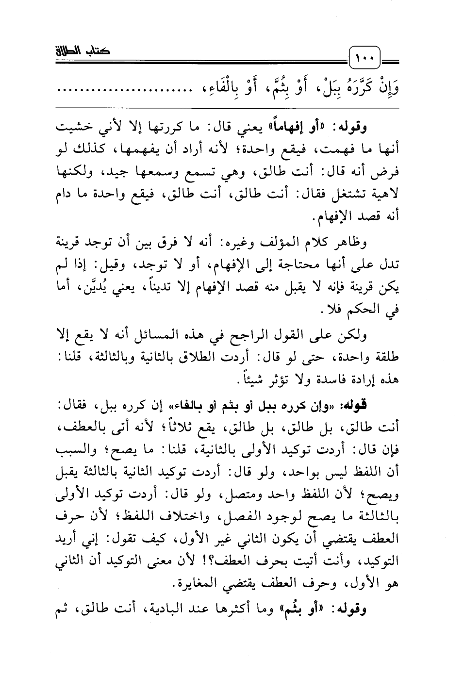 قوله: «وإن كرره ببل أو بثم أو بالفاء» إن كرره ببل، فقال: أنت طالق، بل طالق، بل طالق، يقع ثلاثاً؛ لأنه أتى بالعطف، فإن قال: أردت توكيد الأولى بالثانية، قلنا: ما يصح؛ والسبب أن اللفظ ليس بواحد، ولو قال: أردت توكيد الثانية بالثالثة يقبل ويصح؛ لأن اللفظ واحد ومتصل، ولو قال: أردت توكيد الأولى بالثالثة ما يصح لوجود الفصل، واختلاف اللفظ؛ لأن حرف العطف يقتضي أن يكون الثاني غير الأول، كيف تقول: إني أريد التوكيد، وأنت أتيت بحرف العطف؟! لأن معنى التوكيد أن الثاني هو الأول، وحرف العطف يقتضي المغايرة.