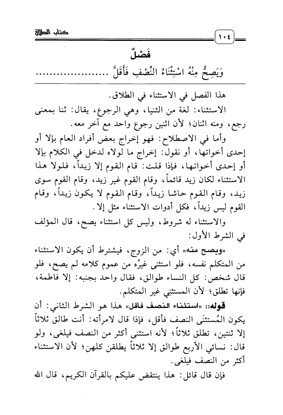 قوله:: «استثناء النصف فأقل» هذا هو الشرط الثاني: أن يكون المُستثنَى النصف فأقل، فإذا قال لامرأته: أنت طالق ثلاثاً إلا ثنتين، تطلق ثلاثاً؛ لأنه استثنى أكثر من النصف فيلغى، ولو قال: نسائي الأربع طوالق إلا ثلاثاً يطلقن كلهن؛ لأن الاستثناء أكثر من النصف فيلغى.
