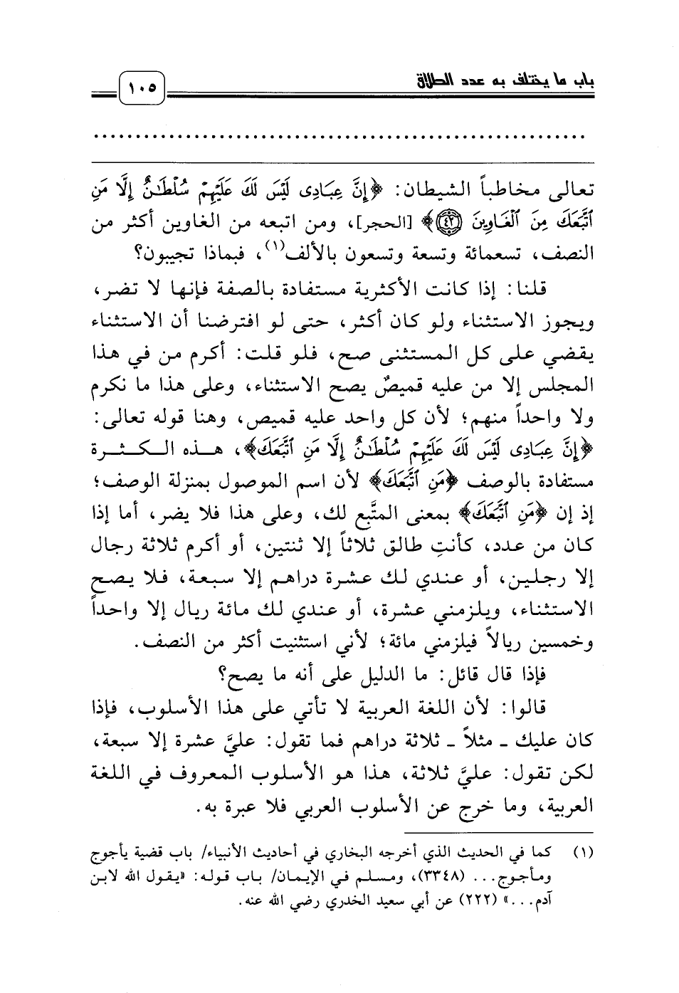 قلنا: إذا كانت الأكثرية مستفادة بالصفة فإنها لا تضر، ويجوز الاستثناء ولو كان أكثر، حتى لو افترضنا أن الاستثناء يقضي على كل المستثنى صح، فلو قلت: أكرم من في هذا المجلس إلا من عليه قميصٌ يصح الاستثناء، وعلى هذا ما نكرم ولا واحداً منهم؛ لأن كل واحد عليه قميص، وهنا قوله تعالى: {إِنَّ عِبَادِي لَيْسَ لَكَ عَلَيْهِمْ سُلْطَانٌ إِلاَّ مَنِ اتَّبَعَكَ}، هذه الكثرة مستفادة بالوصف {مَنِ اتَّبَعَكَ} لأن اسم الموصول بمنزلة الوصف؛ إذ إن {مَنِ اتَّبَعَكَ} بمعنى المتَّبِع لك، وعلى هذا فلا يضر، أما إذا كان من عدد، كأنتِ طالق ثلاثاً إلا ثنتين، أو أكرم ثلاثة رجال إلا رجلين، أو عندي لك عشرة دراهم إلا سبعة، فلا يصح الاستثناء، ويلزمني عشرة، أو عندي لك مائة ريال إلا واحداً وخمسين ريالاً فيلزمني مائة؛ لأني استثنيت أكثر من النصف.
