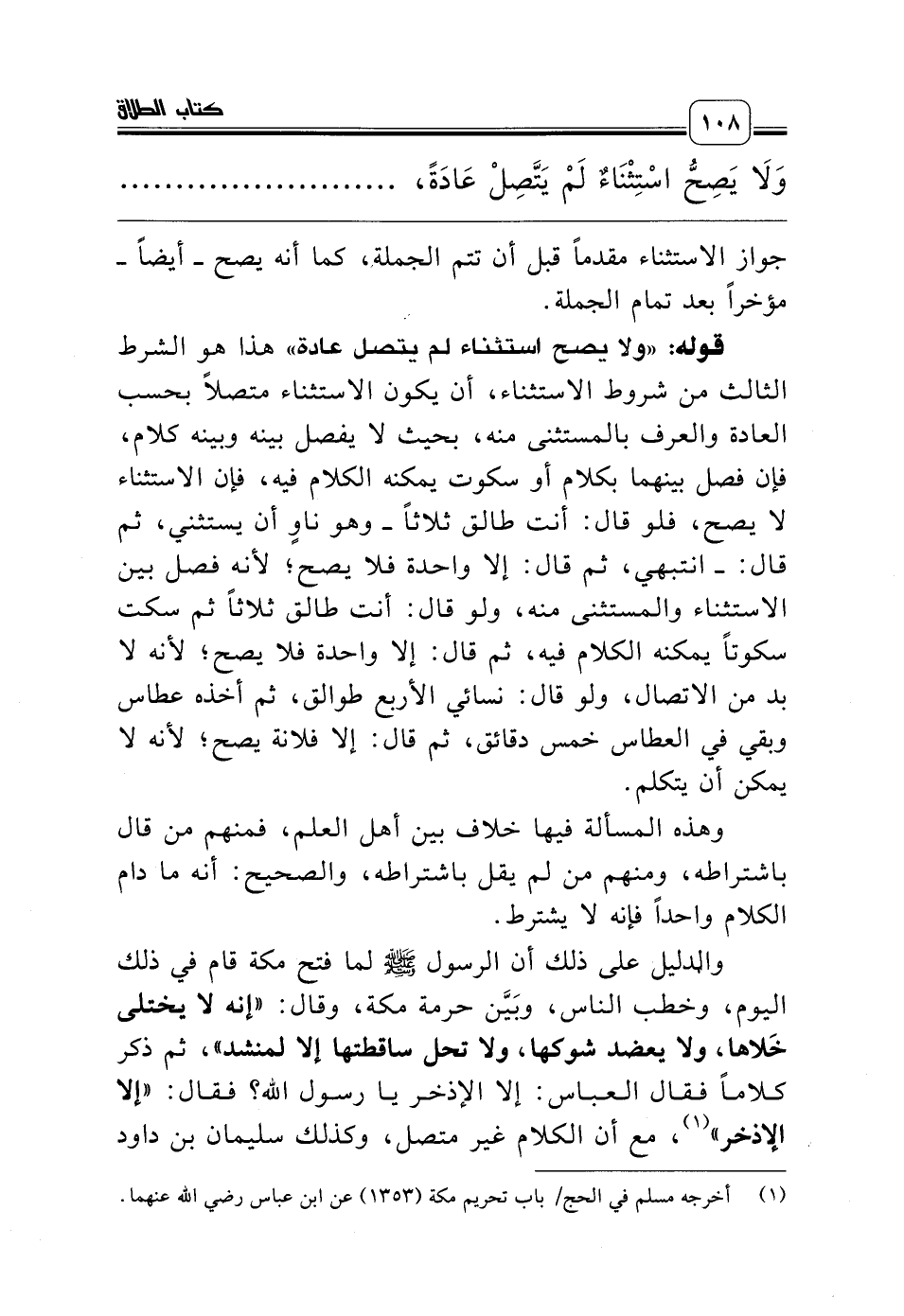 قوله: «ولا يصح استثناء لم يتصل عادة» هذا هو الشرط الثالث من شروط الاستثناء، أن يكون الاستثناء متصلاً بحسب العادة والعرف بالمستثنى منه، بحيث لا يفصل بينه وبينه كلام، فإن فصل بينهما بكلام أو سكوت يمكنه الكلام فيه، فإن الاستثناء لا يصح، فلو قال: أنت طالق ثلاثاً ـ وهو ناوٍ أن يستثني، ثم قال: ـ انتبهي، ثم قال: إلا واحدة فلا يصح؛ لأنه فصل بين الاستثناء والمستثنى منه، ولو قال: أنت طالق ثلاثاً ثم سكت سكوتاً يمكنه الكلام فيه، ثم قال: إلا واحدة فلا يصح؛ لأنه لا بد من الاتصال، ولو قال: نسائي الأربع طوالق، ثم أخذه عطاس وبقي في العطاس خمس دقائق، ثم قال: إلا فلانة يصح؛ لأنه لا يمكن أن يتكلم.