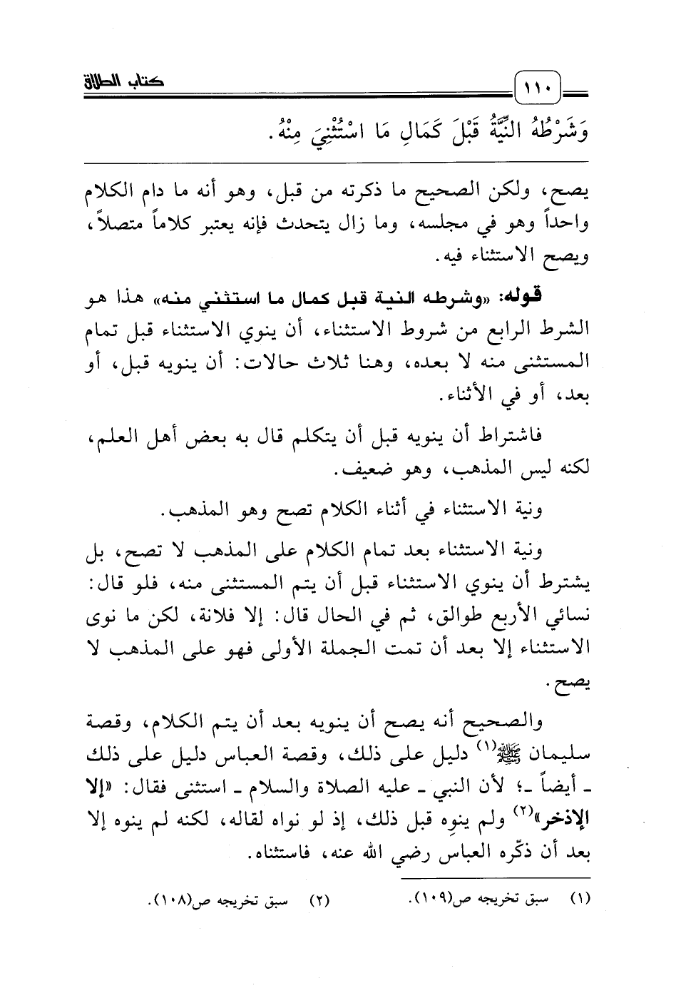 قوله: «وشرطه النية قبل كمال ما استثني منه» هذا هو الشرط الرابع من شروط الاستثناء، أن ينوي الاستثناء قبل تمام المستثنى منه لا بعده، وهنا ثلاث حالات: أن ينويه قبل، أو بعد، أو في الأثناء.