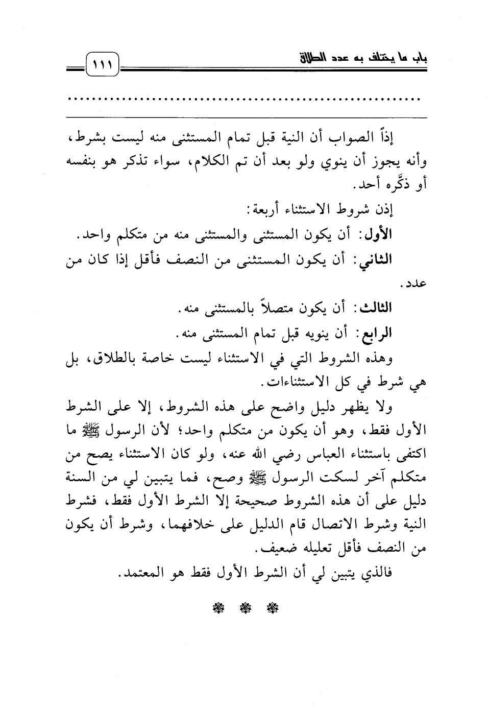 ولا يظهر دليل واضح على هذه الشروط، إلا على الشرط الأول فقط، وهو أن يكون من متكلم واحد؛ لأن الرسول صلّى الله عليه وسلّم ما اكتفى باستثناء العباس رضي الله عنه، ولو كان الاستثناء يصح من متكلم آخر لسكت الرسول صلّى الله عليه وسلّم وصح، فما يتبين لي من السنة دليل على أن هذه الشروط صحيحة إلا الشرط الأول فقط، فشرط النية وشرط الاتصال قام الدليل على خلافهما، وشرط أن يكون من النصف فأقل تعليله ضعيف.