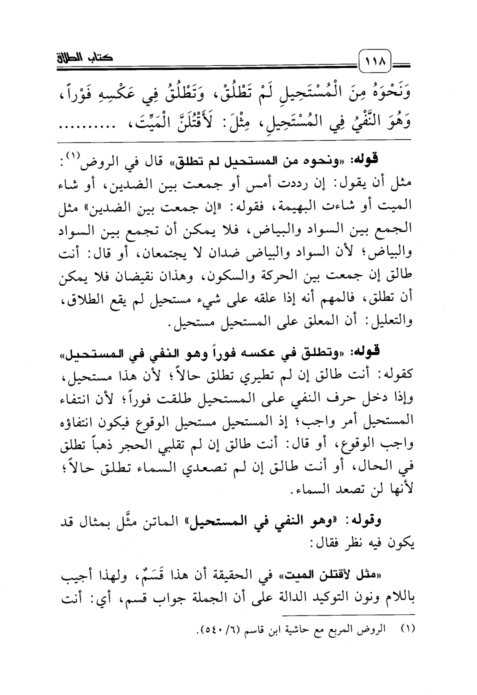 قوله: «ونحوه من المستحيل لم تطلق» قال في الروض (¬1): مثل أن يقول: إن رددت أمس أو جمعت بين الضدين، أو شاء الميت أو شاءت البهيمة، فقوله: «إن جمعت بين الضدين» مثل الجمع بين السواد والبياض، فلا يمكن أن تجمع بين السواد والبياض؛ لأن السواد والبياض ضدان لا يجتمعان، أو قال: أنت طالق إن جمعت بين الحركة والسكون، وهذان نقيضان فلا يمكن أن تطلق، فالمهم أنه إذا علقه على شيء مستحيل لم يقع الطلاق، والتعليل: أن المعلق على المستحيل مستحيل.