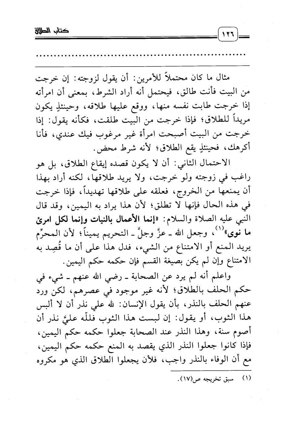 الاحتمال الثاني: أن لا يكون قصده إيقاع الطلاق، بل هو راغب في زوجته ولو خرجت، ولا يريد طلاقها، لكنه أراد بهذا أن يمنعها من الخروج، فعلقه على طلاقها تهديداً، فإذا خرجت في هذه الحال فإنها لا تطلق؛ لأن هذا يراد به اليمين، وقد قال النبي عليه الصلاة والسلام: «إنما الأعمال بالنيات وإنما لكل امرئ ما نوى» (¬1)، وجعل الله ـ عزّ وجل ـ التحريم يميناً؛ لأن المحرِّم يريد المنع أو الامتناع من الشيء، فدل هذا على أن ما قُصِد به الامتناع وإن لم يكن بصيغة القسم فإن حكمه حكم اليمين.