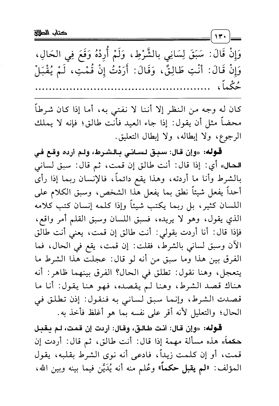 قوله: «وإن قال: أنت طالق، وقال: أردت إن قمت، لم يقبل حكماً» هذه مسألة مهمة إذا قال: أنت طالق، ثم قال: أردت إن قمت، أو إن كلمت زيداً، فادعى أنه نوى الشرط بقلبه، يقول المؤلف: «لم يقبل حكماً» وعُلم منه أنه يُدَيَّن فيما بينه وبين الله،