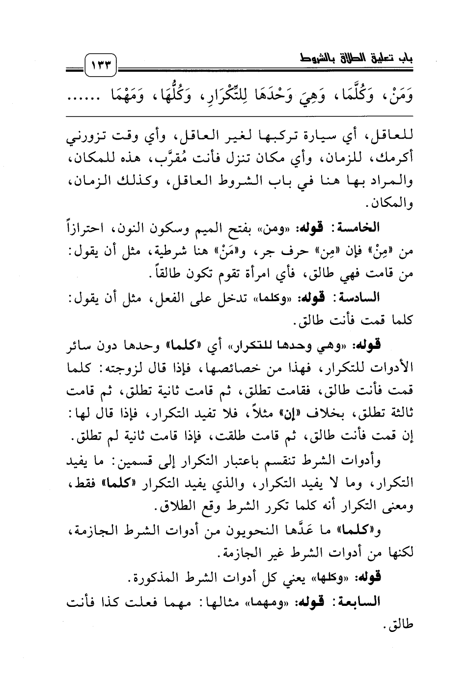 قوله: «وهي وحدها للتكرار» أي «كلما» وحدها دون سائر الأدوات للتكرار، فهذا من خصائصها، فإذا قال لزوجته: كلما قمت فأنت طالق، فقامت تطلق، ثم قامت ثانية تطلق، ثم قامت ثالثة تطلق، بخلاف «إن» مثلاً، فلا تفيد التكرار، فإذا قال لها: إن قمت فأنت طالق، ثم قامت طلقت، فإذا قامت ثانية لم تطلق.
