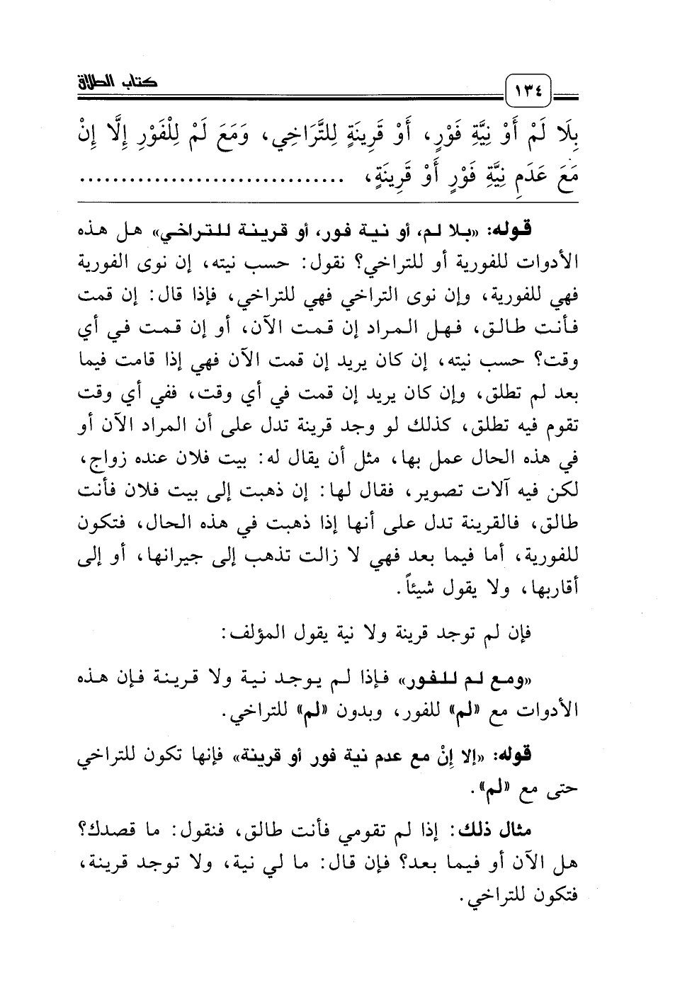 قوله: «بلا لم، أو نية فور، أو قرينة للتراخي» هل هذه الأدوات للفورية أو للتراخي؟ نقول: حسب نيته، إن نوى الفورية فهي للفورية، وإن نوى التراخي فهي للتراخي، فإذا قال: إن قمت فأنت طالق، فهل المراد إن قمت الآن، أو إن قمت في أي وقت؟ حسب نيته، إن كان يريد إن قمت الآن فهي إذا قامت فيما بعد لم تطلق، وإن كان يريد إن قمت في أي وقت، ففي أي وقت تقوم فيه تطلق، كذلك لو وجد قرينة تدل على أن المراد الآن أو في هذه الحال عمل بها، مثل أن يقال له: بيت فلان عنده زواج، لكن فيه آلات تصوير، فقال لها: إن ذهبت إلى بيت فلان فأنت طالق، فالقرينة تدل على أنها إذا ذهبت في هذه الحال، فتكون للفورية، أما فيما بعد فهي لا زالت تذهب إلى جيرانها، أو إلى أقاربها، ولا يقول شيئاً.