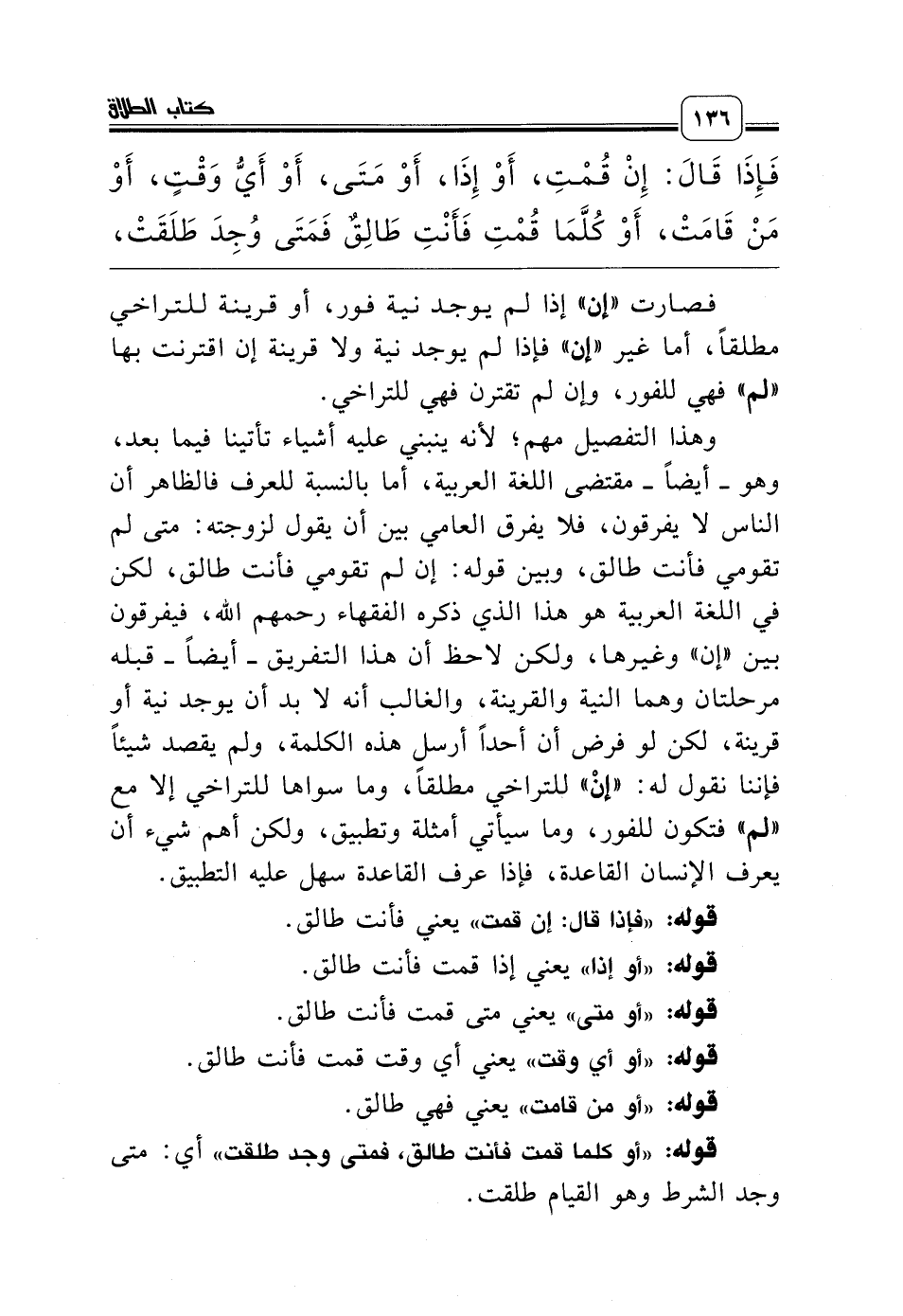 وهذا التفصيل مهم؛ لأنه ينبني عليه أشياء تأتينا فيما بعد، وهو ـ أيضاً ـ مقتضى اللغة العربية، أما بالنسبة للعرف فالظاهر أن الناس لا يفرقون، فلا يفرق العامي بين أن يقول لزوجته: متى لم تقومي فأنت طالق، وبين قوله: إن لم تقومي فأنت طالق، لكن في اللغة العربية هو هذا الذي ذكره الفقهاء رحمهم الله، فيفرقون بين «إن» وغيرها، ولكن لاحظ أن هذا التفريق ـ أيضاً ـ قبله مرحلتان وهما النية والقرينة، والغالب أنه لا بد أن يوجد نية أو قرينة، لكن لو فرض أن أحداً أرسل هذه الكلمة، ولم يقصد شيئاً فإننا نقول له: «إنْ» للتراخي مطلقاً، وما سواها للتراخي إلا مع «لم» فتكون للفور، وما سيأتي أمثلة وتطبيق، ولكن أهم شيء أن يعرف الإنسان القاعدة، فإذا عرف القاعدة سهل عليه التطبيق.