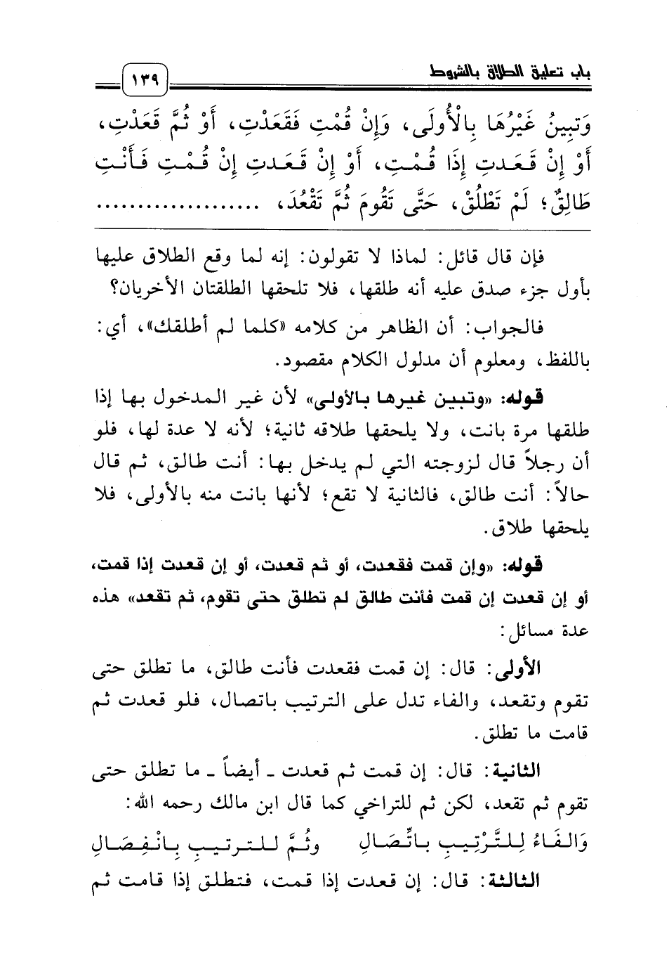 قوله: «وإن قمت فقعدت، أو ثم قعدت، أو إن قعدت إذا قمت، أو إن قعدت إن قمت فأنت طالق لم تطلق حتى تقوم، ثم تقعد» هذه عدة مسائل: