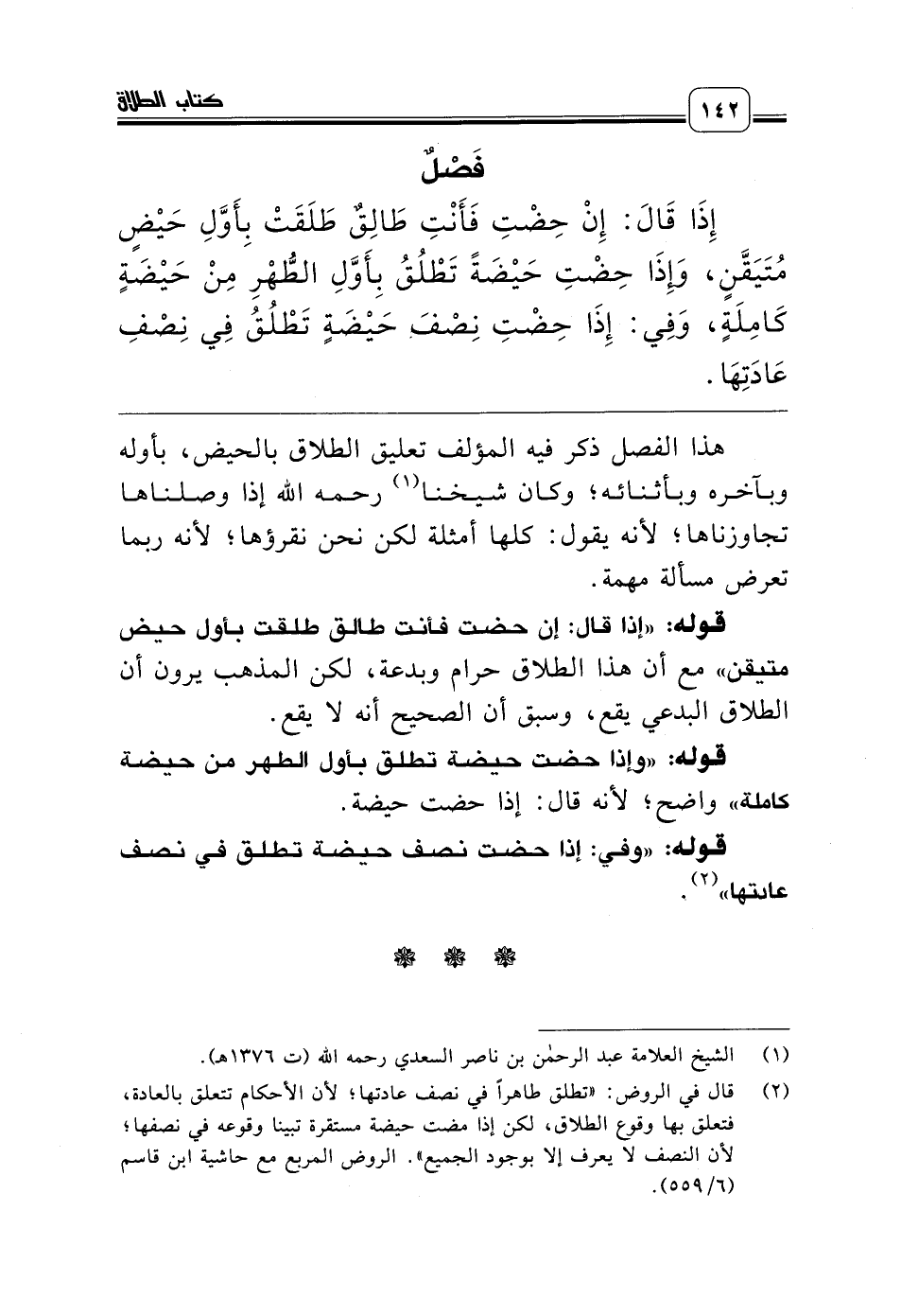 (¬2) قال في الروض: «تطلق طاهراً في نصف عادتها؛ لأن الأحكام تتعلق بالعادة، فتعلق بها وقوع الطلاق، لكن إذا مضت حيضة مستقرة تبينا وقوعه في نصفها؛ لأن النصف لا يعرف إلا بوجود الجميع». الروض المربع مع حاشية ابن قاسم (6/ 559).