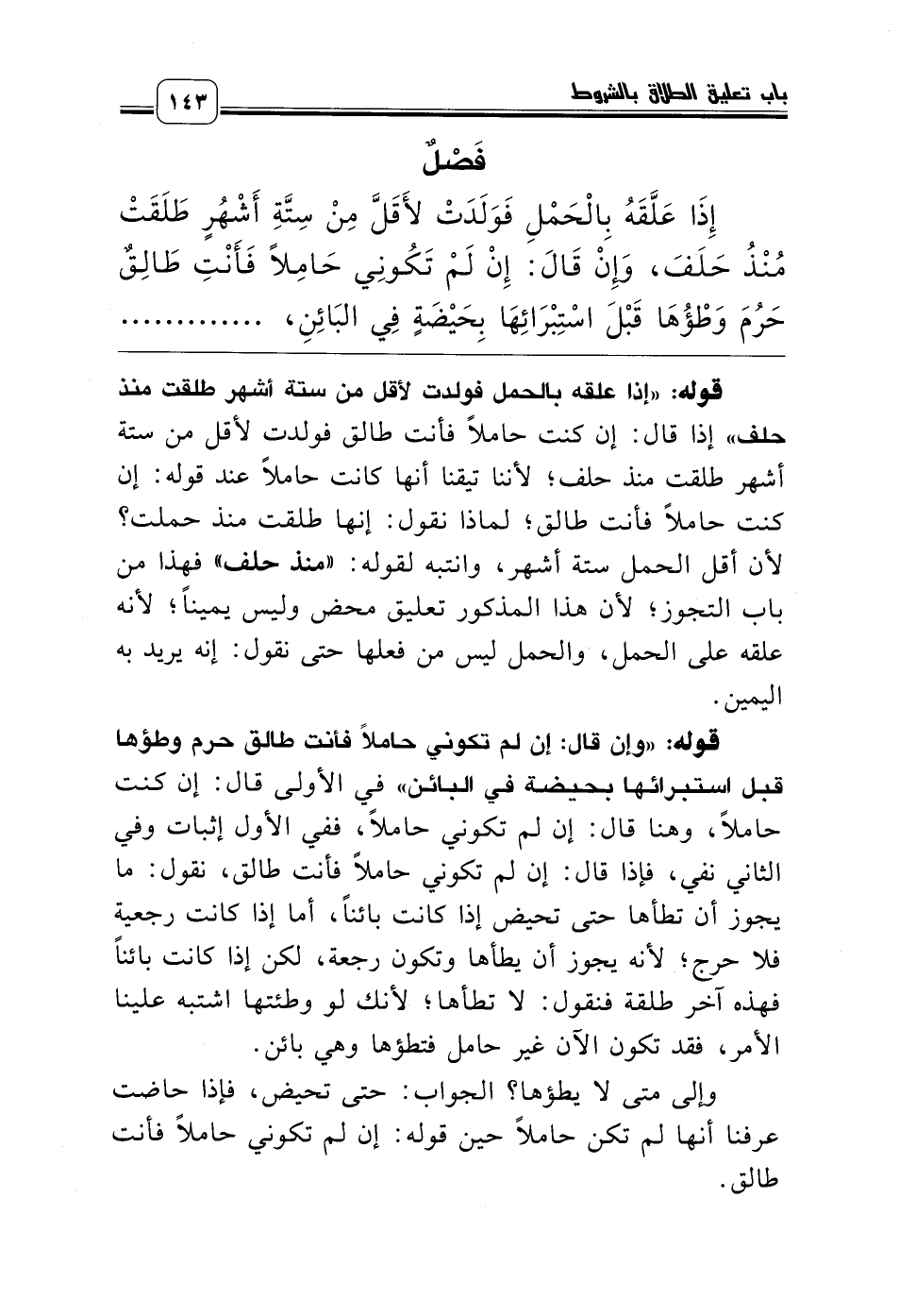 قوله: «وإن قال: إن لم تكوني حاملاً فأنت طالق حرم وطؤها قبل استبرائها بحيضة في البائن» في الأولى قال: إن كنت حاملاً، وهنا قال: إن لم تكوني حاملاً، ففي الأول إثبات وفي الثاني نفي، فإذا قال: إن لم تكوني حاملاً فأنت طالق، نقول: ما يجوز أن تطأها حتى تحيض إذا كانت بائناً، أما إذا كانت رجعية فلا حرج؛ لأنه يجوز أن يطأها وتكون رجعة، لكن إذا كانت بائناً فهذه آخر طلقة فنقول: لا تطأها؛ لأنك لو وطئتها اشتبه علينا الأمر، فقد تكون الآن غير حامل فتطؤها وهي بائن.