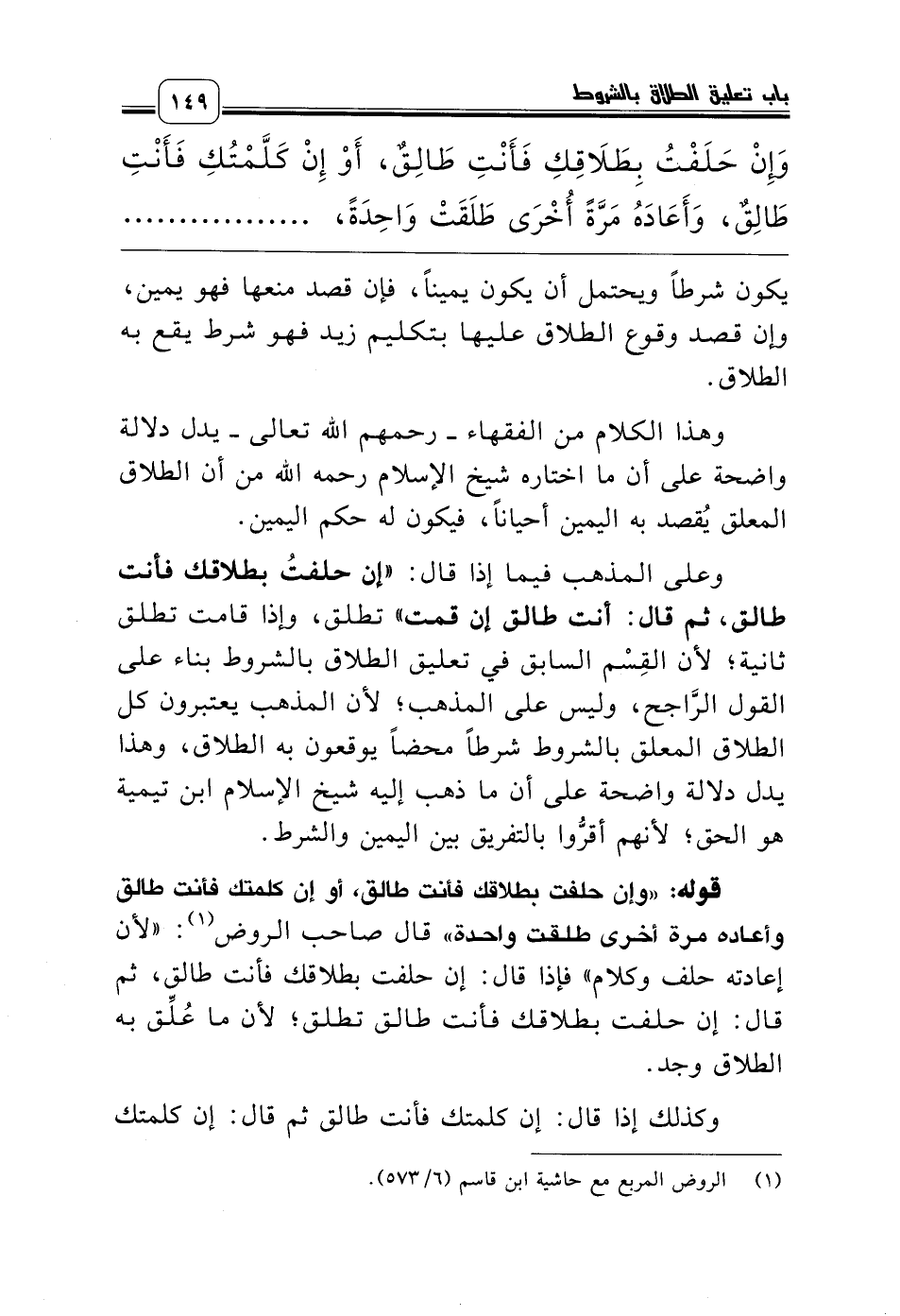 وعلى المذهب فيما إذا قال: «إن حلفتُ بطلاقك فأنت طالق، ثم قال: أنت طالق إن قمت» تطلق، وإذا قامت تطلق ثانية؛ لأن القِسْم السابق في تعليق الطلاق بالشروط بناء على القول الرَّاجح، وليس على المذهب؛ لأن المذهب يعتبرون كل الطلاق المعلق بالشروط شرطاً محضاً يوقعون به الطلاق، وهذا يدل دلالة واضحة على أن ما ذهب إليه شيخ الإسلام ابن تيمية هو الحق؛ لأنهم أقرُّوا بالتفريق بين اليمين والشرط.