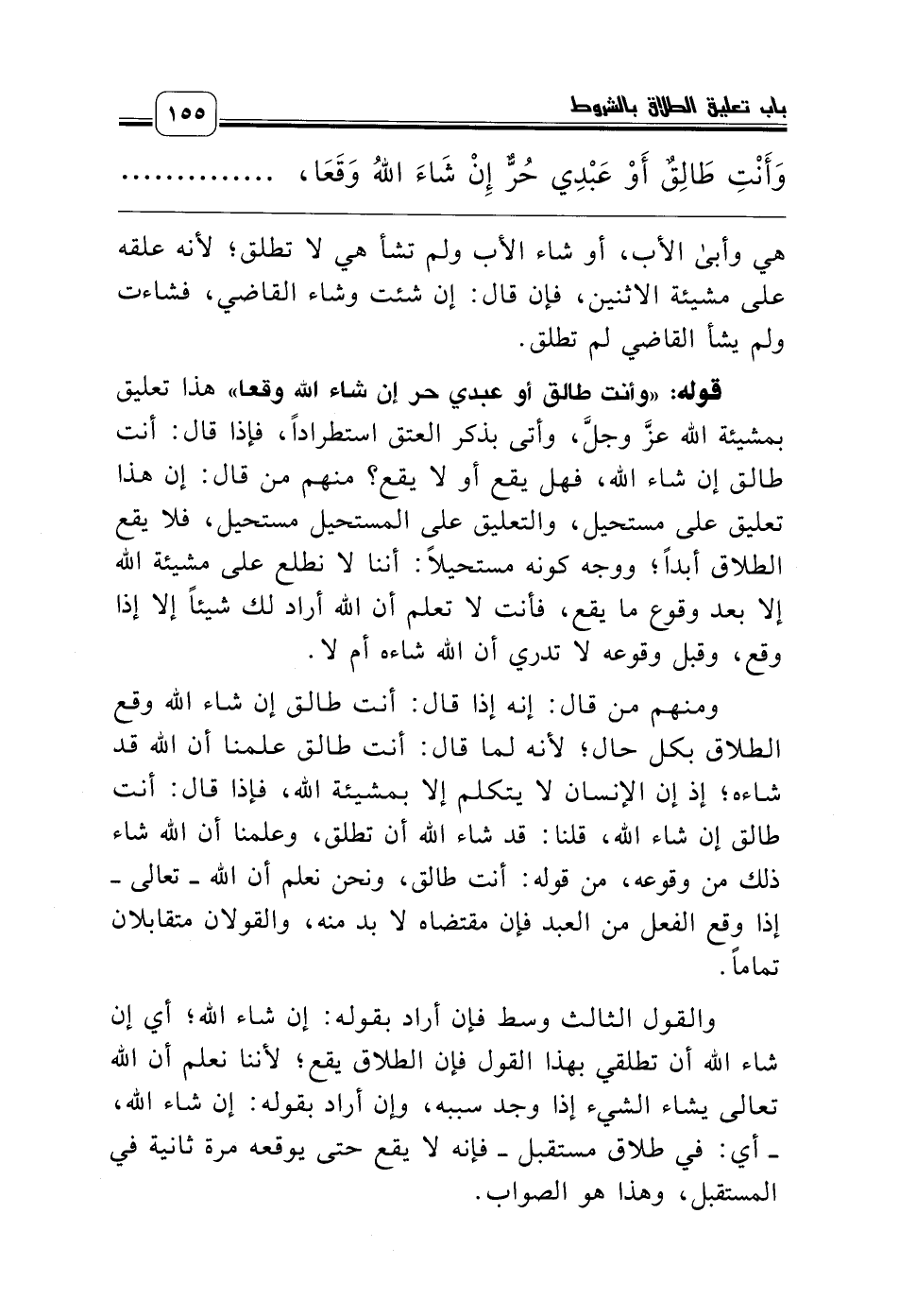 والقول الثالث وسط فإن أراد بقوله: إن شاء الله؛ أي إن شاء الله أن تطلقي بهذا القول فإن الطلاق يقع؛ لأننا نعلم أن الله تعالى يشاء الشيء إذا وجد سببه، وإن أراد بقوله: إن شاء الله، ـ أي: في طلاق مستقبل ـ فإنه لا يقع حتى يوقعه مرة ثانية في المستقبل، وهذا هو الصواب.