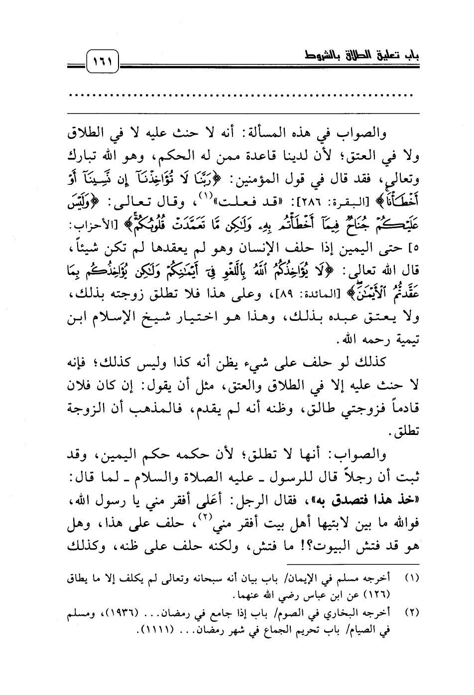 والصواب في هذه المسألة: أنه لا حنث عليه لا في الطلاق ولا في العتق؛ لأن لدينا قاعدة ممن له الحكم، وهو الله تبارك وتعالى، فقد قال في قول المؤمنين: {رَبَّنَا لاَ تُؤَاخِذْنَا إِنْ نَسِيْنَا أَوْ أَخْطَأْنَا} [البقرة: 286]: «قد فعلت» (¬1)، وقال تعالى: {وَلَيْسَ عَلَيْكُمْ جُنَاحٌ فِيمَا أَخْطَأْتُمْ بِهِ وَلَكِنْ مَا تَعَمَّدَتْ قُلُوبُكُمْ} [الأحزاب: 5] حتى اليمين إذا حلف الإنسان وهو لم يعقدها لم تكن شيئاً، قال الله تعالى: {لاَ يُؤَاخِذُكُمُ اللَّهُ بِاللَّغْوِ فِي أَيْمَانِكُمْ وَلَكِنْ يُؤَاخِذُكُمْ بِمَا عَقَّدْتُّمُ الأَيْمَانَ} [المائدة: 89]، وعلى هذا فلا تطلق زوجته بذلك، ولا يعتق عبده بذلك، وهذا هو اختيار شيخ الإسلام ابن تيمية رحمه الله.