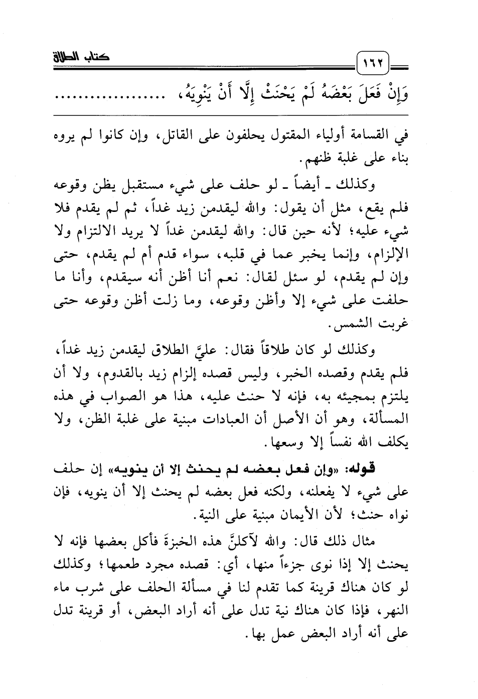 قوله: «وإن فعل بعضه لم يحنث إلا أن ينويه» إن حلف على شيء لا يفعلنه، ولكنه فعل بعضه لم يحنث إلا أن ينويه، فإن نواه حنث؛ لأن الأيمان مبنية على النية.