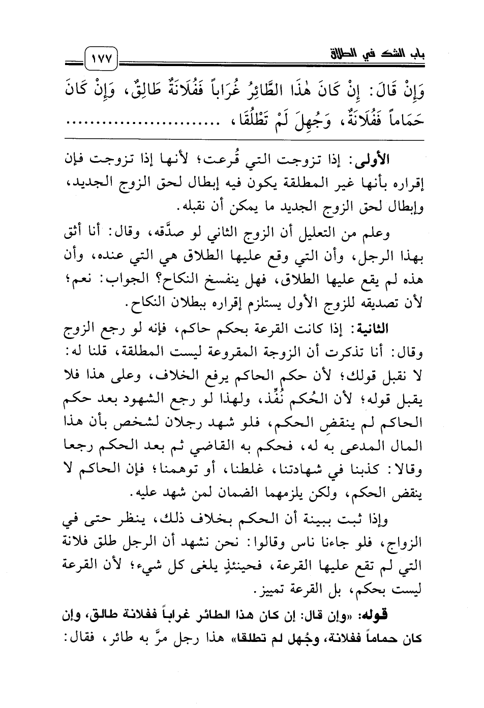 قوله: «وإن قال: إن كان هذا الطائر غراباً ففلانة طالق، وإن كان حماماً ففلانة، وجُهل لم تطلقا» هذا رجل مرَّ به طائر، فقال: