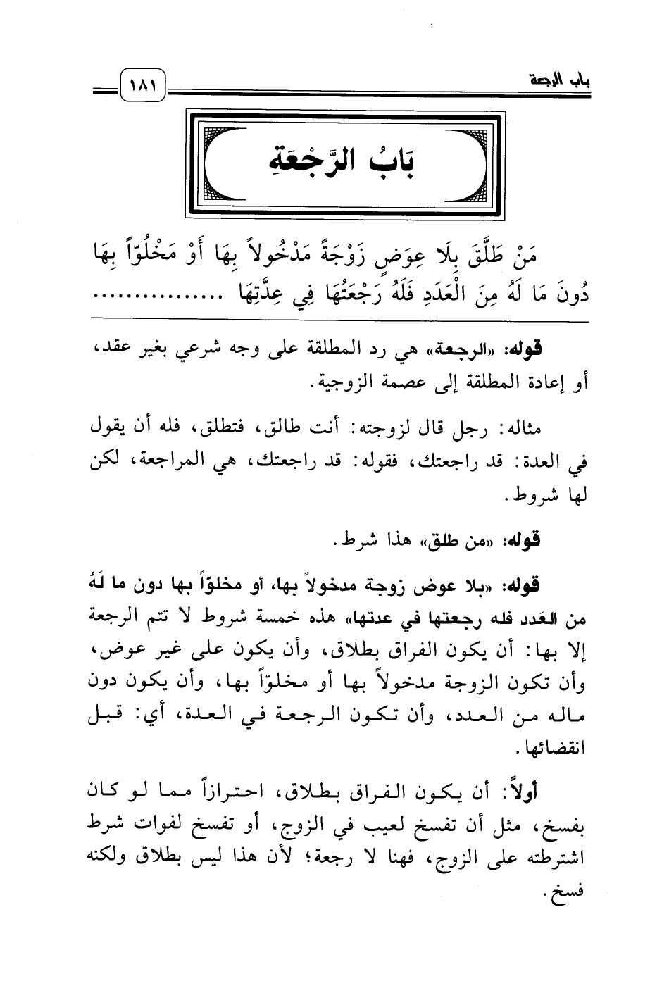 مَنْ طَلَّقَ بِلاَ عِوَضٍ زَوْجَةً مَدْخُولاً بِهَا أَوْ مَخْلُوّاً بِهَا دُونَ مَا لَهُ مِنَ الْعَدَدِ فَلَهُ رَجْعَتُهَا فِي عِدَّتِهَا ..........................