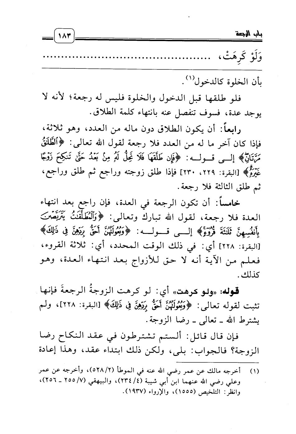 قوله: «ولو كرهت» أي: لو كرهت الزوجةُ الرجعةَ فإنها تثبت لقوله تعالى: {وَبُعُولَتُهُنَّ أَحَقُّ بِرَدِّهِنَّ فِي ذَلِكَ} [البقرة: 228]، ولم يشترط الله ـ تعالى ـ رضا الزوجة.
