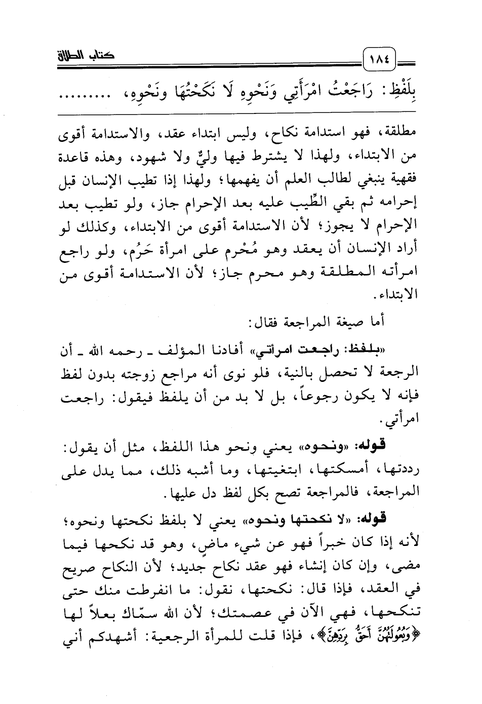 مطلقة، فهو استدامة نكاح، وليس ابتداء عقد، والاستدامة أقوى من الابتداء، ولهذا لا يشترط فيها وليٌّ ولا شهود، وهذه قاعدة فقهية ينبغي لطالب العلم أن يفهمها؛ ولهذا إذا تطيب الإنسان قبل إحرامه ثم بقي الطِّيب عليه بعد الإحرام جاز، ولو تطيب بعد الإحرام لا يجوز؛ لأن الاستدامة أقوى من الابتداء، وكذلك لو أراد الإنسان أن يعقد وهو مُحْرم على امرأة حَرُم، ولو راجع امرأته المطلقة وهو محرم جاز؛ لأن الاستدامة أقوى من الابتداء.