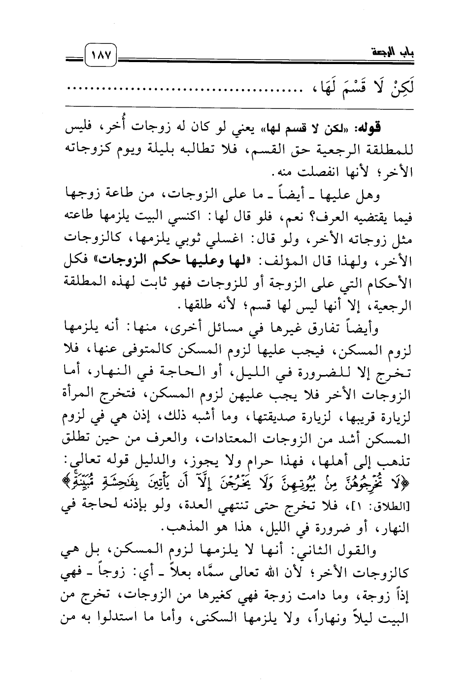 قوله: «لكن لا قسم لها» يعني لو كان له زوجات أُخر، فليس للمطلقة الرجعية حق القسم، فلا تطالبه بليلة ويوم كزوجاته الأخر؛ لأنها انفصلت منه.