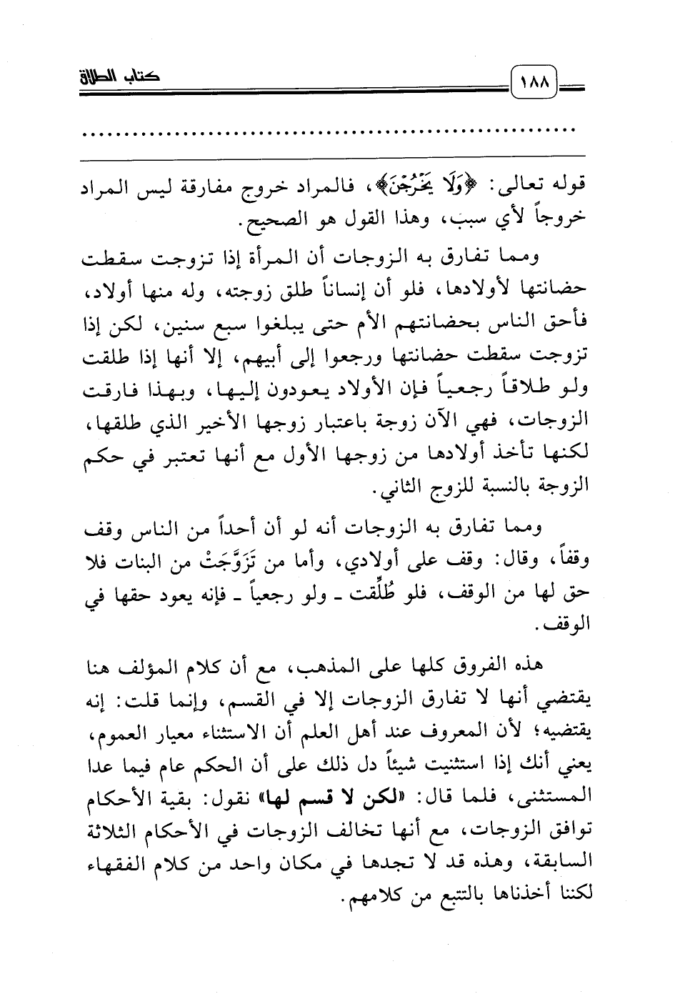 ومما تفارق به الزوجات أن المرأة إذا تزوجت سقطت حضانتها لأولادها، فلو أن إنساناً طلق زوجته، وله منها أولاد، فأحق الناس بحضانتهم الأم حتى يبلغوا سبع سنين، لكن إذا تزوجت سقطت حضانتها ورجعوا إلى أبيهم، إلا أنها إذا طلقت ولو طلاقاً رجعياً فإن الأولاد يعودون إليها، وبهذا فارقت الزوجات، فهي الآن زوجة باعتبار زوجها الأخير الذي طلقها، لكنها تأخذ أولادها من زوجها الأول مع أنها تعتبر في حكم الزوجة بالنسبة للزوج الثاني.