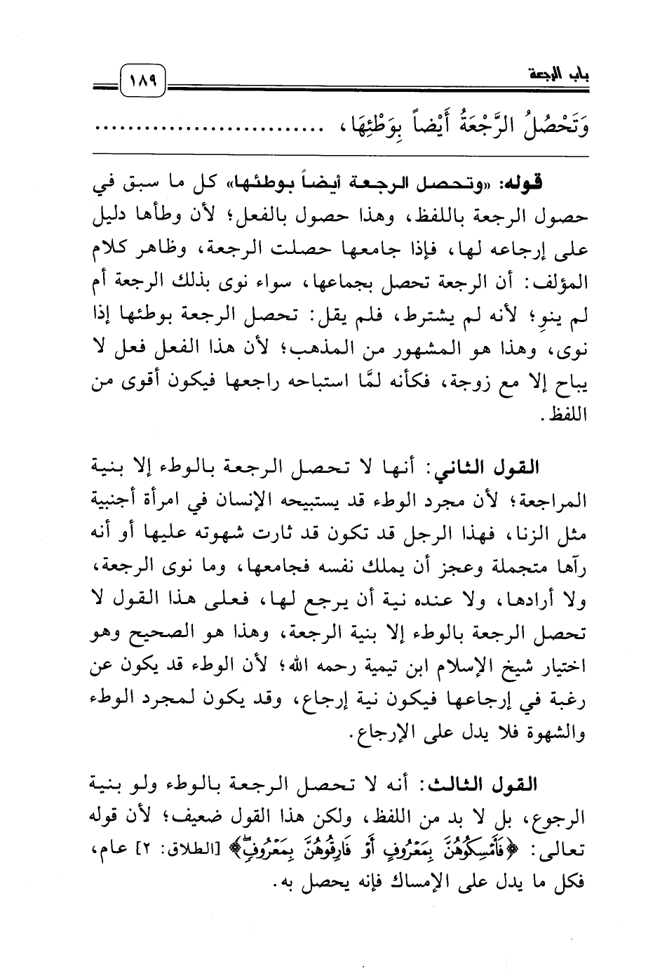 القول الثالث: أنه لا تحصل الرجعة بالوطء ولو بنية الرجوع، بل لا بد من اللفظ، ولكن هذا القول ضعيف؛ لأن قوله تعالى: {فَأَمْسِكُوهُنَّ بِمَعْرُوفٍ أَوْ فَارِقُوهُنَّ بِمَعْرُوفٍ} [الطلاق: 2] عام، فكل ما يدل على الإمساك فإنه يحصل به.