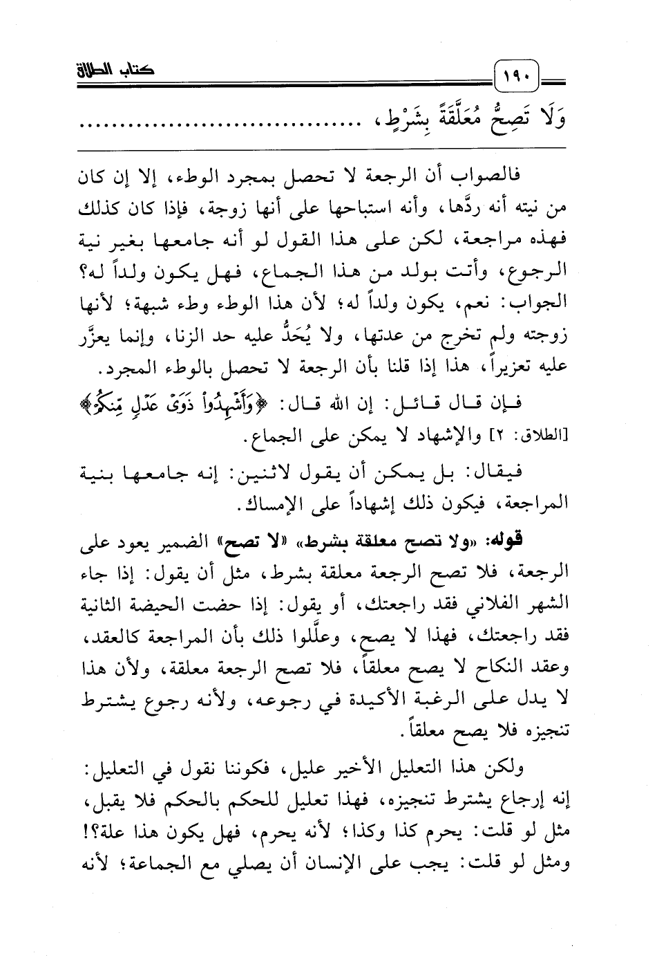 قوله: «ولا تصح معلقة بشرط» «لا تصح» الضمير يعود على الرجعة، فلا تصح الرجعة معلقة بشرط، مثل أن يقول: إذا جاء الشهر الفلاني فقد راجعتك، أو يقول: إذا حضت الحيضة الثانية فقد راجعتك، فهذا لا يصح، وعلَّلوا ذلك بأن المراجعة كالعقد، وعقد النكاح لا يصح معلقاً، فلا تصح الرجعة معلقة، ولأن هذا لا يدل على الرغبة الأكيدة في رجوعه، ولأنه رجوع يشترط تنجيزه فلا يصح معلقاً.