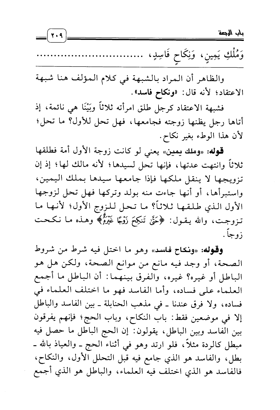 قوله: «وملك يمين» يعني لو كانت زوجة الأول أمة فطلقها ثلاثاً وانتهت عدتها، فإنها تحل لسيدها؛ لأنه مالك لها؛ إذ إن تزويجها لا ينقل ملكها فإذا جامعها سيدها بملك اليمين، واستبرأها، أو أنها جاءت منه بولد وتركها فهل تحل لزوجها الأول الذي طلقها ثلاثاً؟ ما تحل للزوج الأول؛ لأنها ما تزوجت، والله يقول: {حَتَّى تَنْكِحَ زَوْجًا غَيْرَهُ} وهذه ما نكحت زوجاً.