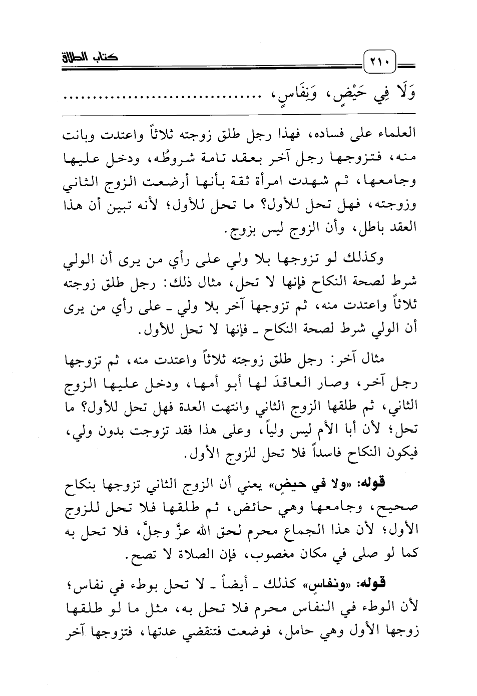 قوله: «ونفاسٍ» كذلك ـ أيضاً ـ لا تحل بوطء في نفاس؛ لأن الوطء في النفاس محرم فلا تحل به، مثل ما لو طلقها زوجها الأول وهي حامل، فوضعت فتنقضي عدتها، فتزوجها آخر