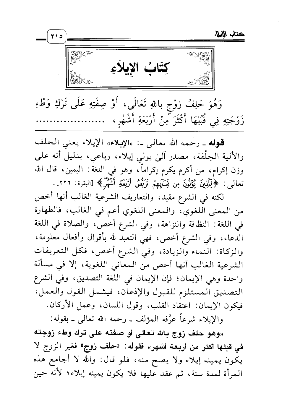 قوله ـ رحمه الله تعالى ـ: «الإيلاء» الإيلاء يعني الحلف والألية الحِلْفة، مصدر آلى يولي إيلاء، رباعي، بدليل أنه على وزن إكرام، من أكرم يكرم إكراماً، وهو في اللغة: اليمين، قال الله تعالى: {لِلَّذِينَ يُؤْلُونَ مِنْ نِسَائِهِمْ تَرَبُّصُ أَرْبَعَةِ أَشْهُرٍ} [البقرة: 226].