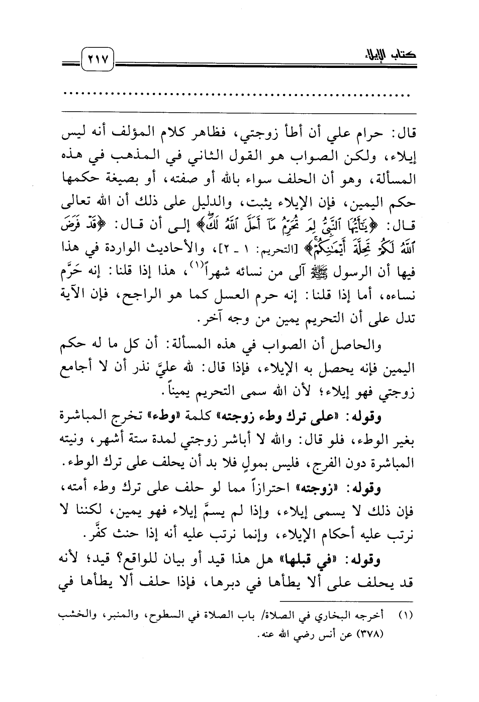 قال: حرام علي أن أطأ زوجتي، فظاهر كلام المؤلف أنه ليس إيلاء، ولكن الصواب هو القول الثاني في المذهب في هذه المسألة، وهو أن الحلف سواء بالله أو صفته، أو بصيغة حكمها حكم اليمين، فإن الإيلاء يثبت، والدليل على ذلك أن الله تعالى قال: {يَاأَيُّهَا النَّبِيُّ لِمَ تُحَرِّمُ مَا أَحَلَّ اللَّهُ لَكَ} إلى أن قال: {قَدْ فَرَضَ اللَّهُ لَكُمْ تَحِلَّةَ أَيْمَانِكُمْ} [التحريم: 1 ـ 2]، والأحاديث الواردة في هذا فيها أن الرسول صلّى الله عليه وسلّم آلى من نسائه شهراً (¬1)، هذا إذا قلنا: إنه حَرَّم نساءه، أما إذا قلنا: إنه حرم العسل كما هو الراجح، فإن الآية تدل على أن التحريم يمين من وجه آخر.