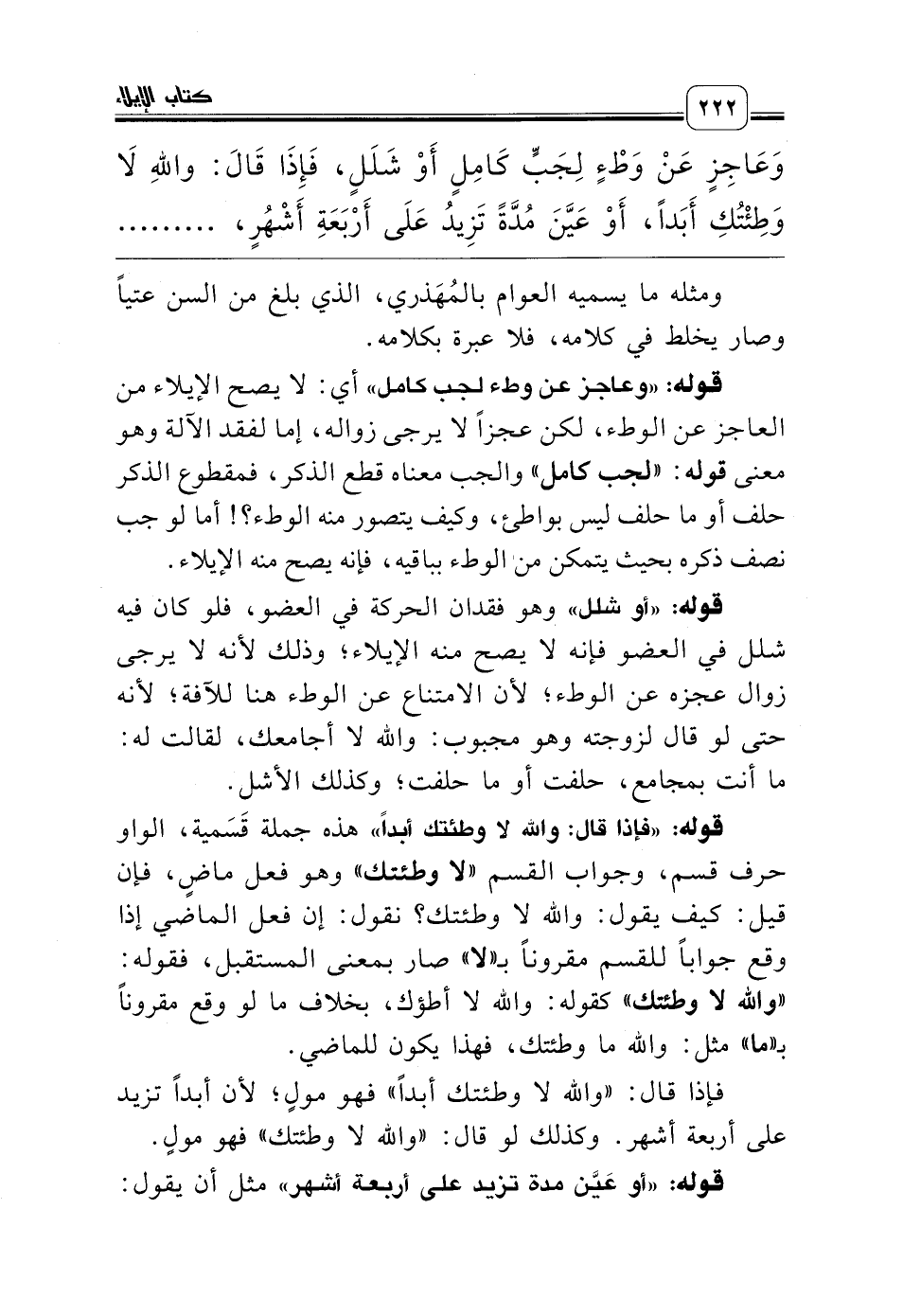 قوله: «أو شلل» وهو فقدان الحركة في العضو، فلو كان فيه شلل في العضو فإنه لا يصح منه الإيلاء؛ وذلك لأنه لا يرجى زوال عجزه عن الوطء؛ لأن الامتناع عن الوطء هنا للآفة؛ لأنه حتى لو قال لزوجته وهو مجبوب: والله لا أجامعك، لقالت له: ما أنت بمجامع، حلفت أو ما حلفت؛ وكذلك الأشل.