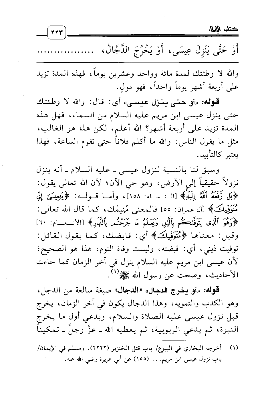 وسبق لنا بالنسبة لنزول عيسى ـ عليه السلام ـ أنه ينزل نزولاً حقيقياً إلى الأرض، وهو حي الآن؛ لأن الله تعالى يقول: {بَلْ رَفَعَهُ اللَّهُ إِلَيْهِ} [النساء: 158]، وأما قوله: {يَاعِيسَى إِنِّي مُتَوَفِّيكَ} [آل عمران: 55] فالمعنى مُنِيمُك، كما قال الله تعالى: {وَهُوَ الَّذِي يَتَوفَّاكُمْ بِاللَّيْلِ وَيَعْلَمُ مَا جَرَحْتُمْ بِالنَّهَارِ} [الأنعام: 60] وقيل: معناها {مُتَوَفِّيكَ} أي: قابضك، كما يقول القائل: توفيت دَيني، أي: قبضته، وليست وفاة النوم، هذا هو الصحيح؛ لأن عيسى ابن مريم عليه السلام ينزل في آخر الزمان كما جاءت الأحاديث، وصحت عن رسول الله صلّى الله عليه وسلّم (¬1).