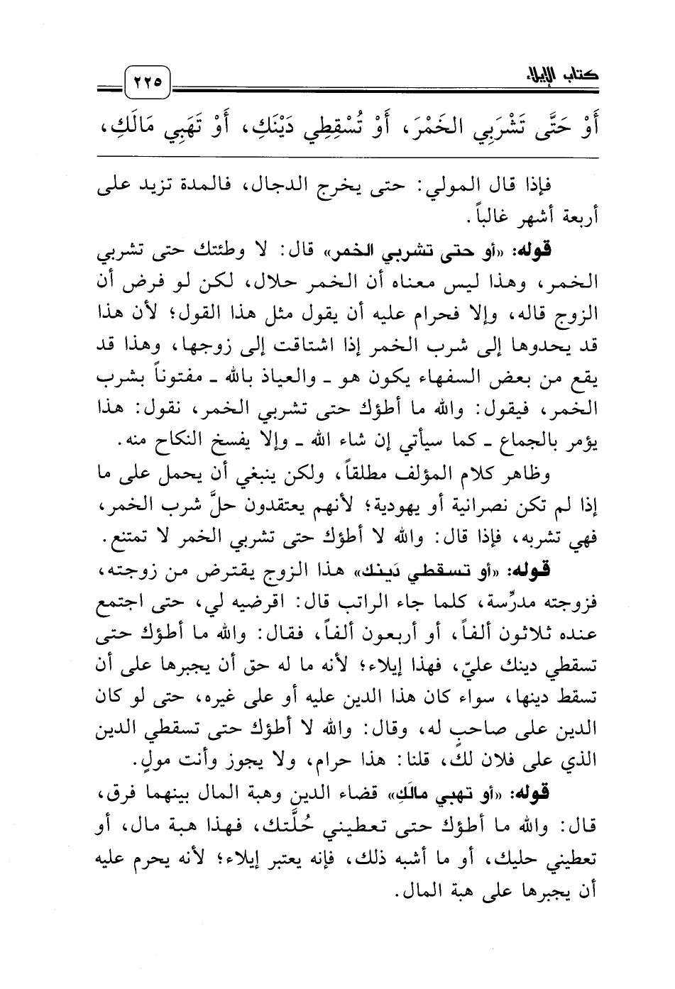 قوله: «أو تهبي مالَكِ» قضاء الدين وهبة المال بينهما فرق، قال: والله ما أطؤك حتى تعطيني حُلَّتك، فهذا هبة مال، أو تعطيني حليك، أو ما أشبه ذلك، فإنه يعتبر إيلاء؛ لأنه يحرم عليه أن يجبرها على هبة المال.