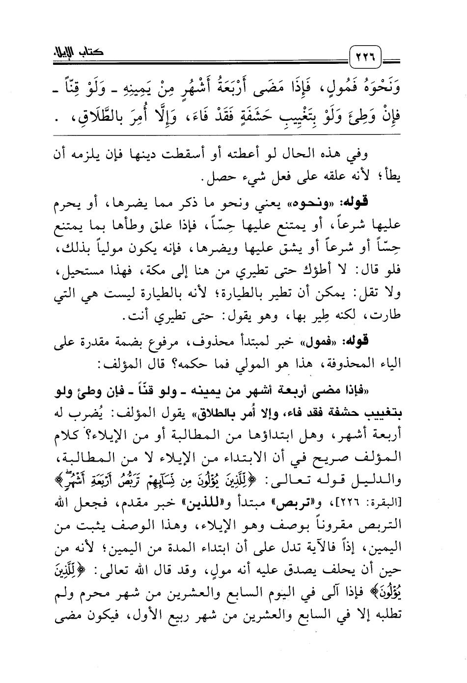 قوله: «ونحوه» يعني ونحو ما ذكر مما يضرها، أو يحرم عليها شرعاً، أو يمتنع عليها حِسّاً، فإذا علق وطأها بما يمتنع حِسّاً أو شرعاً أو يشق عليها ويضرها، فإنه يكون مولياً بذلك، فلو قال: لا أطؤك حتى تطيري من هنا إلى مكة، فهذا مستحيل، ولا تقل: يمكن أن تطير بالطيارة؛ لأنه بالطيارة ليست هي التي طارت، لكنه طِير بها، وهو يقول: حتى تطيري أنت.