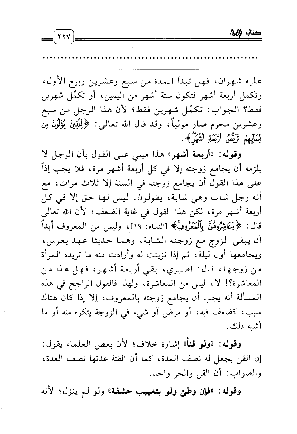 وقوله: «أربعة أشهر» هذا مبني على القول بأن الرجل لا يلزمه أن يجامع زوجته إلا في كل أربعة أشهر مرة، فلا يجب إذاً على هذا القول أن يجامع زوجته في السنة إلا ثلاث مرات، مع أنه رجل شاب وهي شابة، يقولون: ليس لها حق إلا في كل أربعة أشهر مرة، لكن هذا القول في غاية الضعف؛ لأن الله تعالى قال: {وَعَاشِرُوهُنَّ بِالْمَعْرُوفِ} [النساء: 19]، وليس من المعروف أبداً أن يبقى الزوج مع زوجته الشابة، وهما حديثا عهد بعرس، ويجامعها أول ليلة، ثم إذا تزينت له وأرادت منه ما تريده المرأة من زوجها، قال: اصبري، بقي أربعة أشهر، فهل هذا من المعاشرة؟! لا، ليس من المعاشرة، ولهذا فالقول الراجح في هذه المسألة أنه يجب أن يجامع زوجته بالمعروف، إلا إذا كان هناك سبب، كضعف فيه، أو مرض أو شيء في الزوجة يتكره منه أو ما أشبه ذلك.